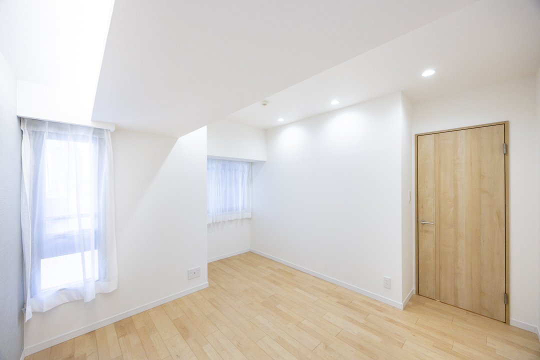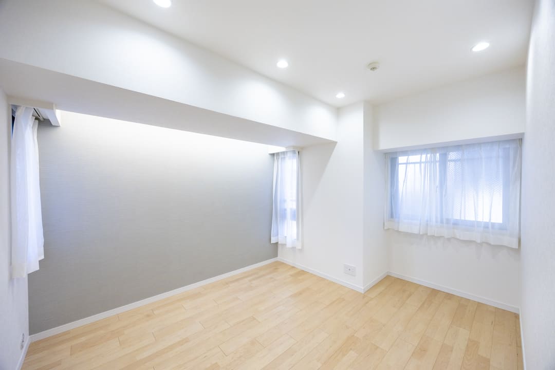 約7.5帖の主寝室はゆとりのあるお部屋。二面採光のため風通しの良い空間となっています。また、収納スペースは造られていませんが、大きめのベッドを配置して、ゆっくりと寛ぐことができそうですよ。