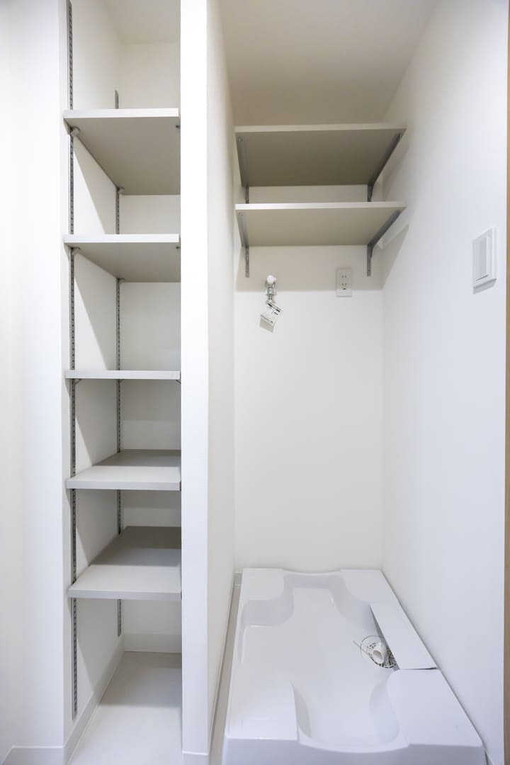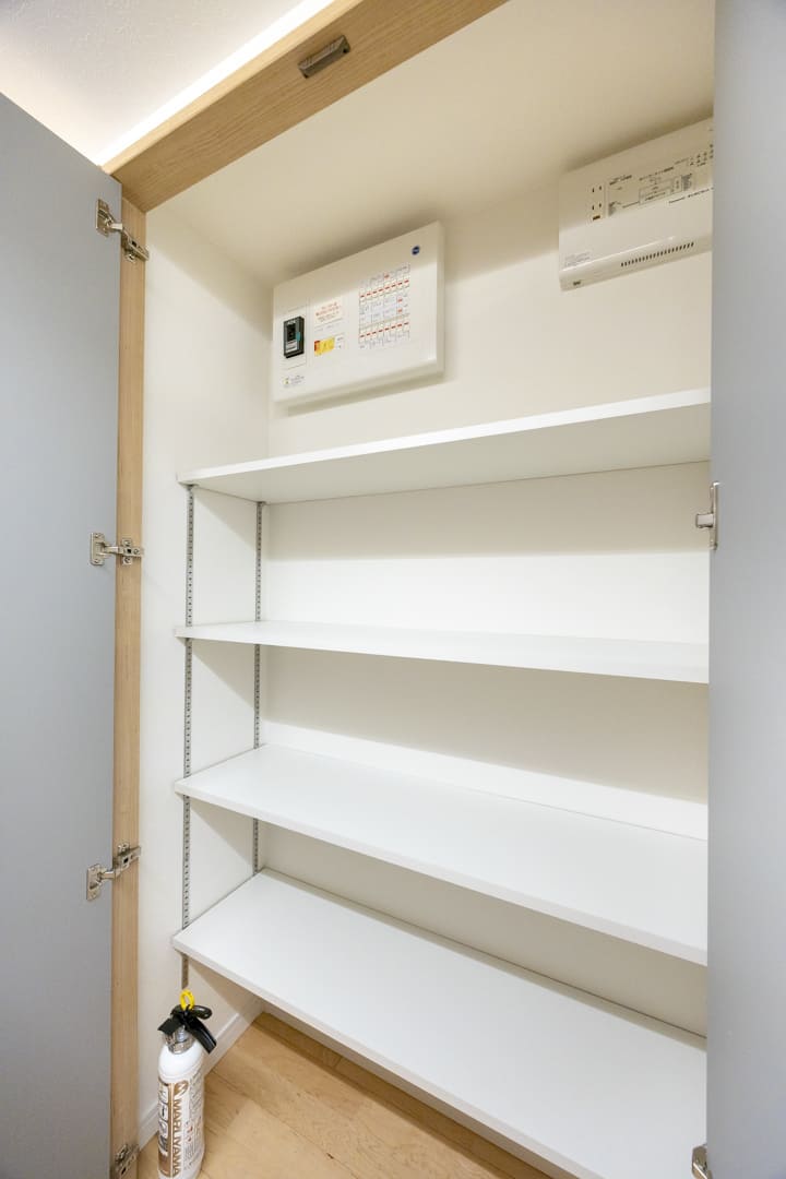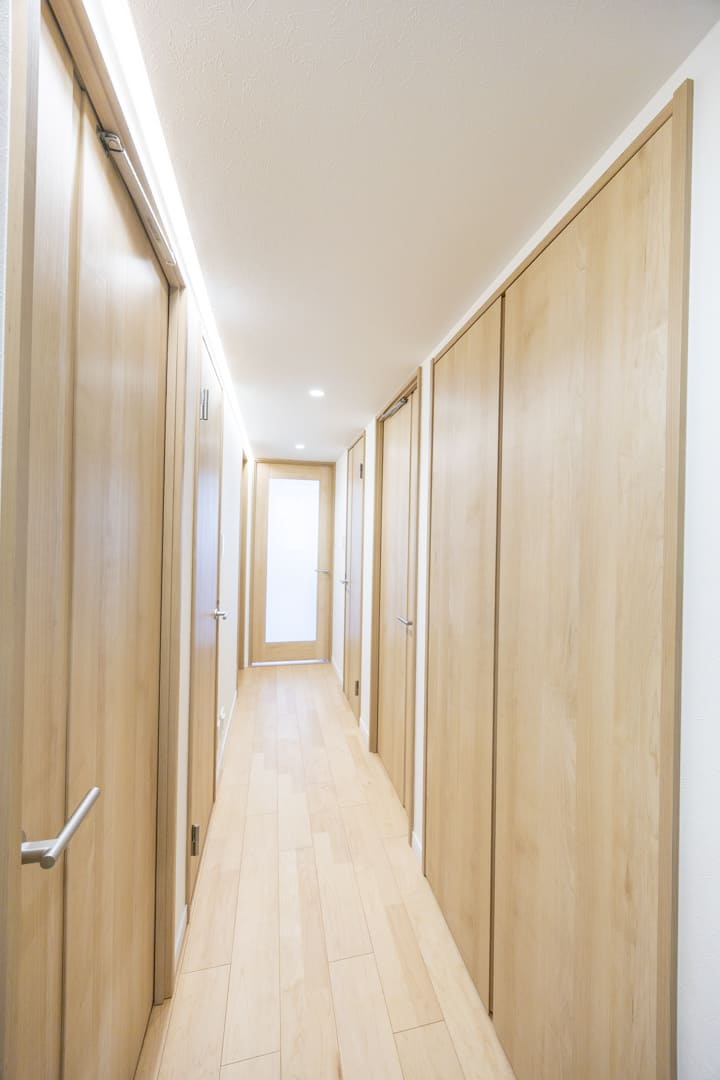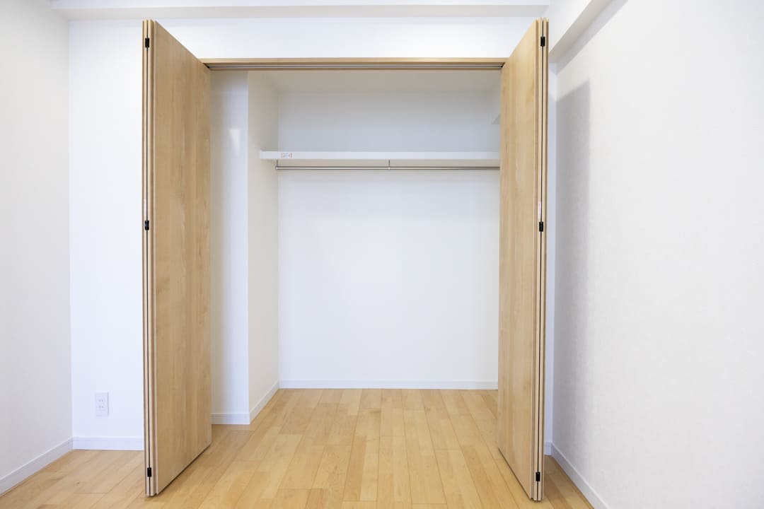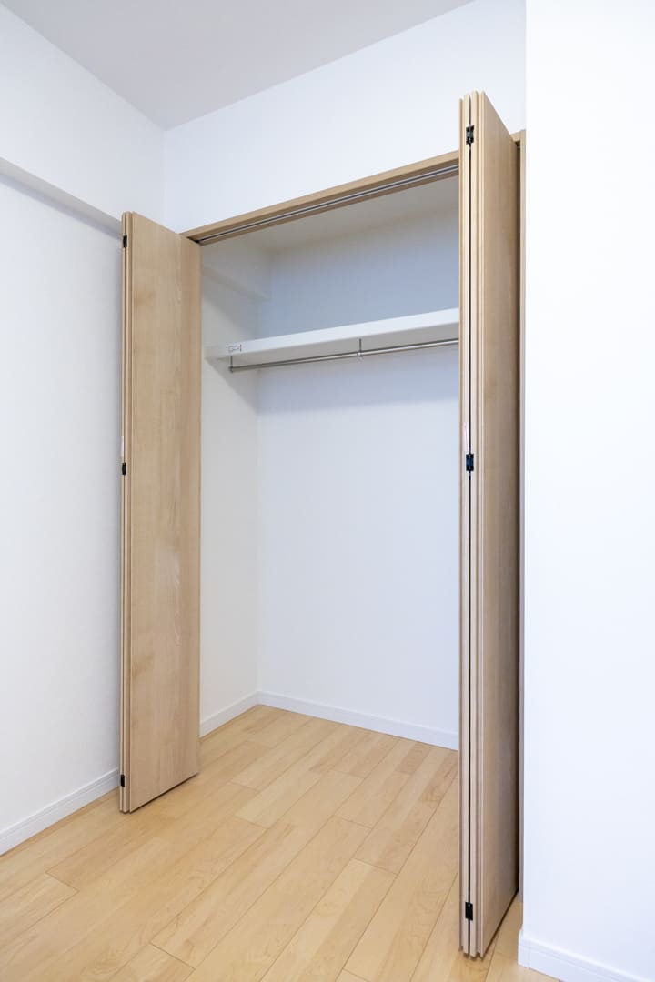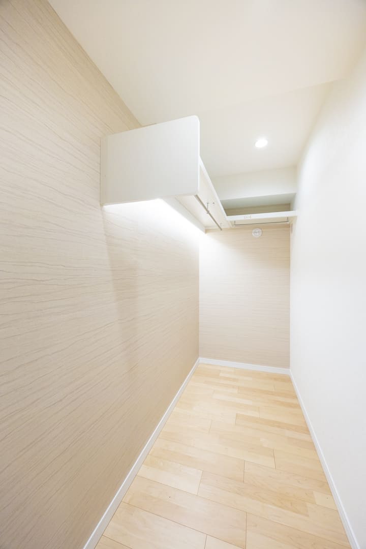 廊下には、衣類や大きめの荷物を収められるウォークインクローゼットが設けられています。パイプハンガーや棚板が備わっており、用途に応じて整理しやすい仕様です。収納場所をしっかり確保することで、居室をすっきりと保ちやすく、空間を有効に活用できます。