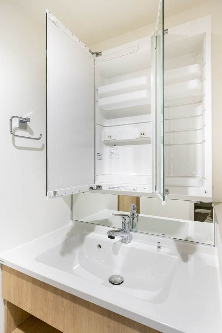 三面鏡の中には化粧品などを収納できて使い勝手良好な化粧台です。背面側にも棚が造られているので、リネン類などもきちんと収納することができそうですよ。