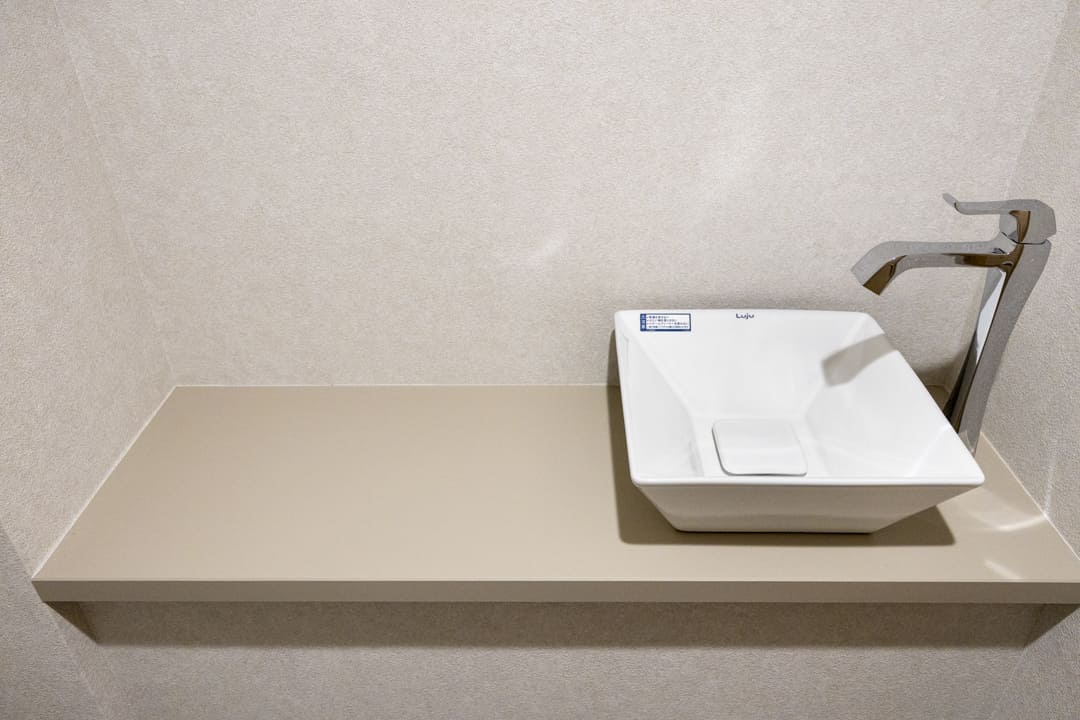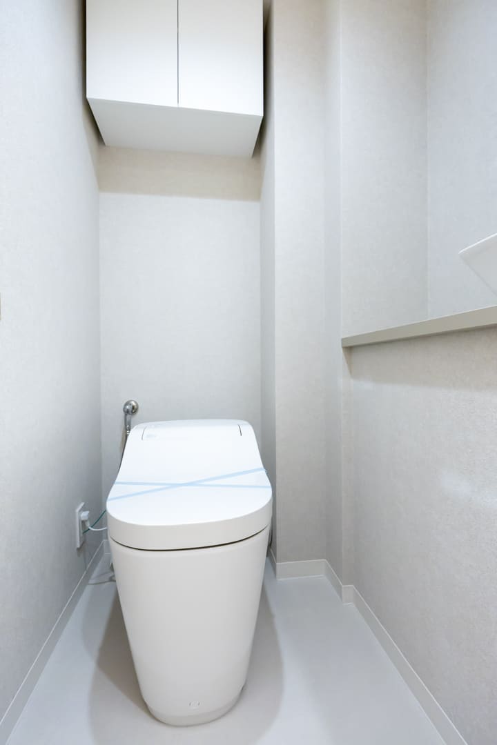ウォシュレット一体型のトイレです。タンクレスタイプなのですっきりとした印象に。また、別途で手洗い器が造られているので、すぐに手を洗うことができて衛生的です。上部には吊戸棚が設置されていて、収納スペースもありますよ。カウンタースペースにはアロマなどを置いても◎。