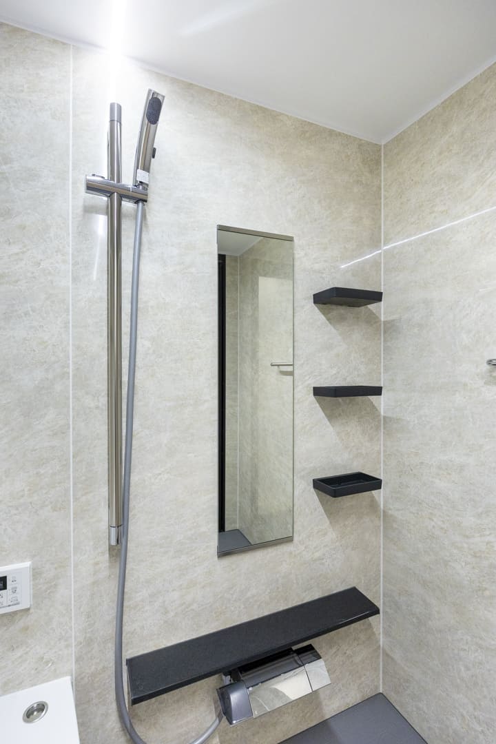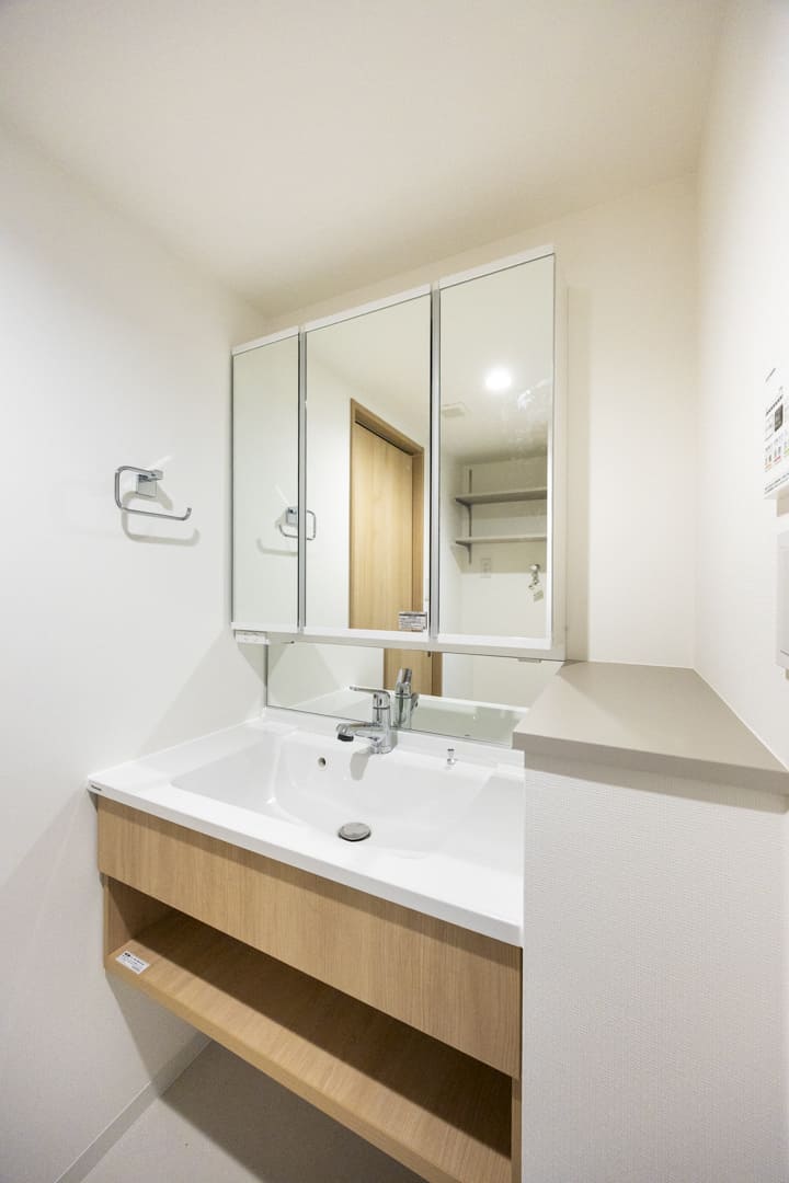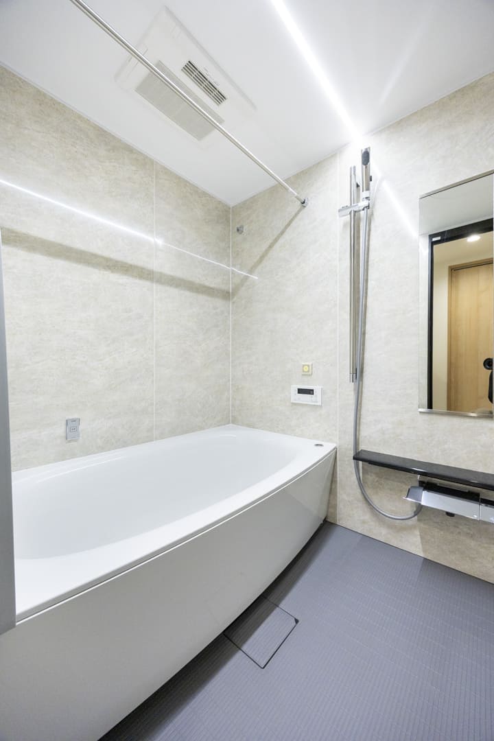 グレーのフロアが落ち着いた雰囲気を演出してくれている浴室です。お風呂にゆっくり浸かるのが好きという方に嬉しい追い焚き機能を搭載。家族の入浴時間がずれてしまっても安心です。浴室乾燥機には暖房・乾燥・換気・涼風の機能がついており、一年中快適に過ごすことができます。