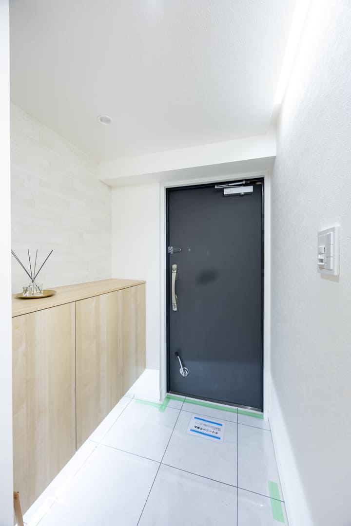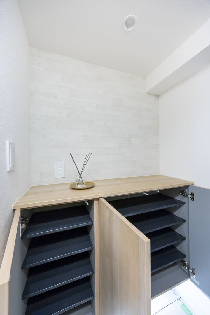 玄関にはシューズボックスが備え付けられています。腰高のため、靴を収納できるだけでなく、小物やアロマなどを飾ることができますよ。フロートタイプでフットライトの光が優しく足元を照らしてくれます。