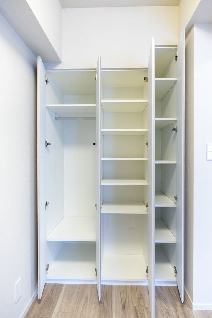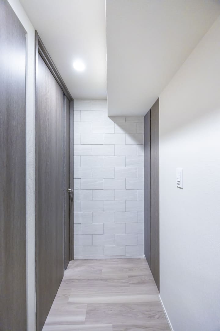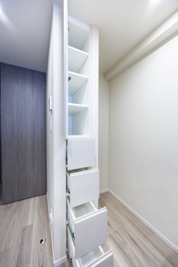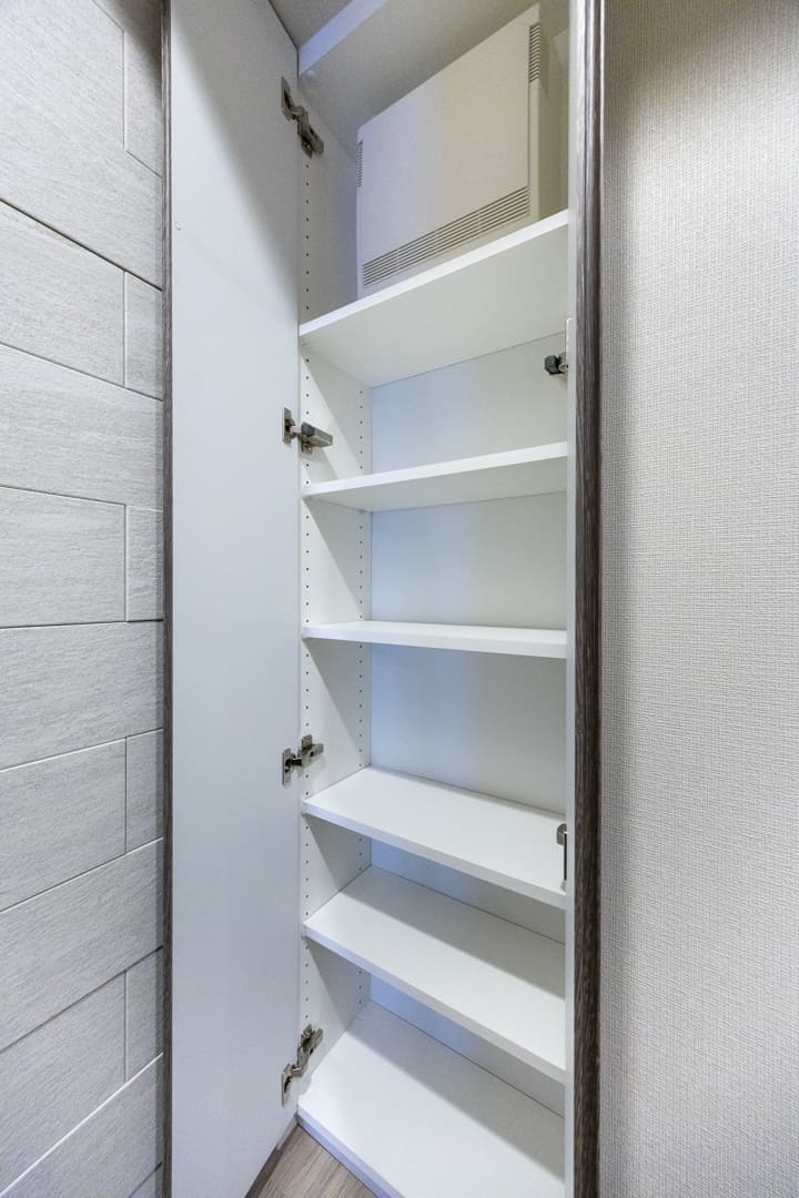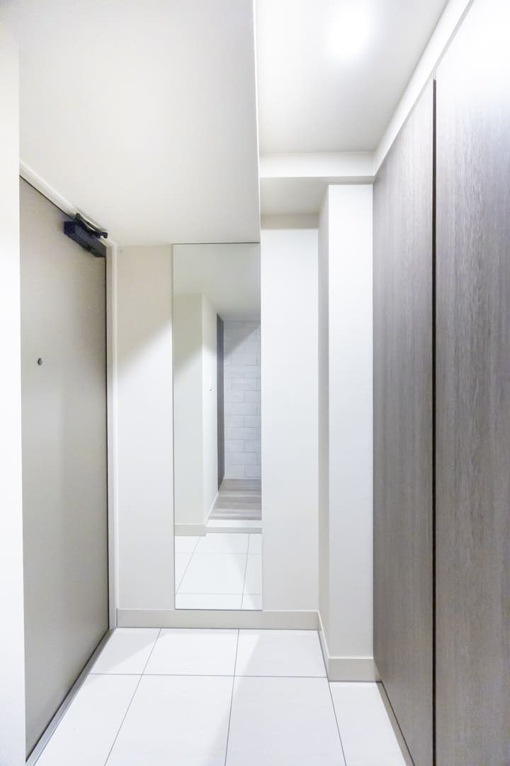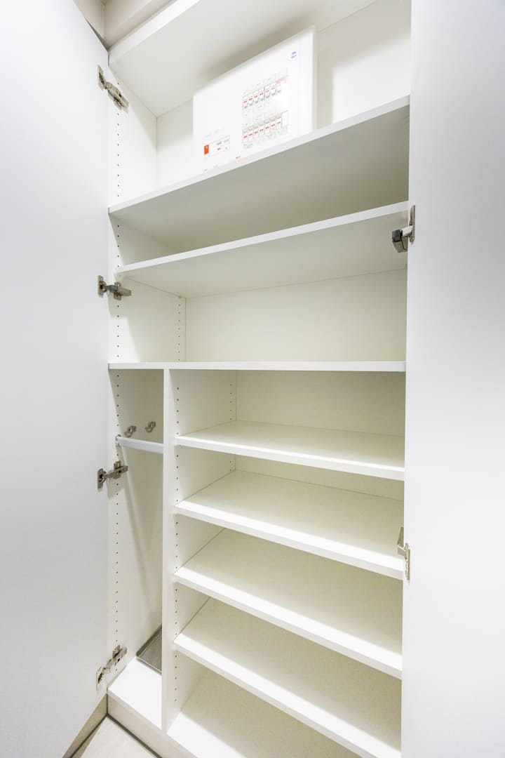 玄関入って正面には収納力◎なシューズボックスが備え付けられています。中には可動棚が設置されているだけでなく、傘立てスペースもあって便利です。また、壁面には鏡が設置されているので、出かける際に全身のコーディネートをチェックすることができますよ。また、廊下にも収納棚が造られています。
