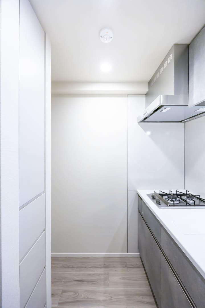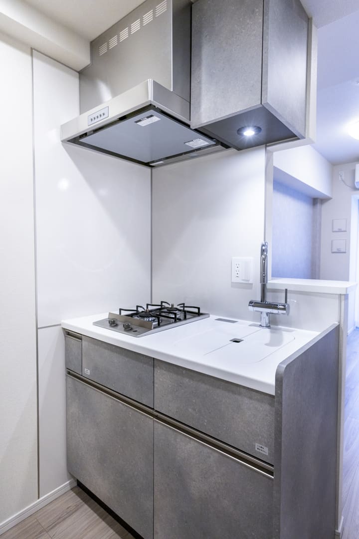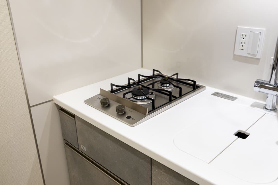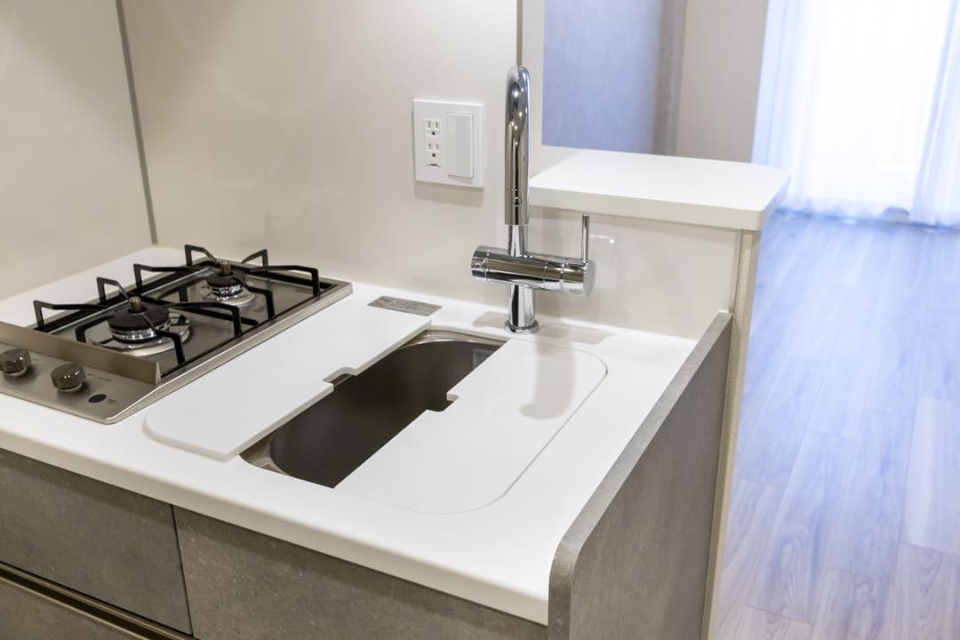 キッチンは、リビングダイニングを見渡しながら料理ができる対面式です。ゲストとのコミュニケーションが取りやすくて◎。しかし、コンロ側には壁がたっているので、油跳ねなどの心配はありません。また、腰壁が高めなため、さりげなく手物を隠してくれるのも特長のひとつです。さらに、2口コンロ、浄水器付きで、背面側には収納棚が造られています。