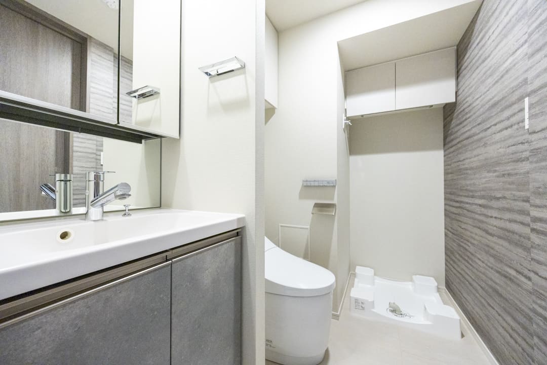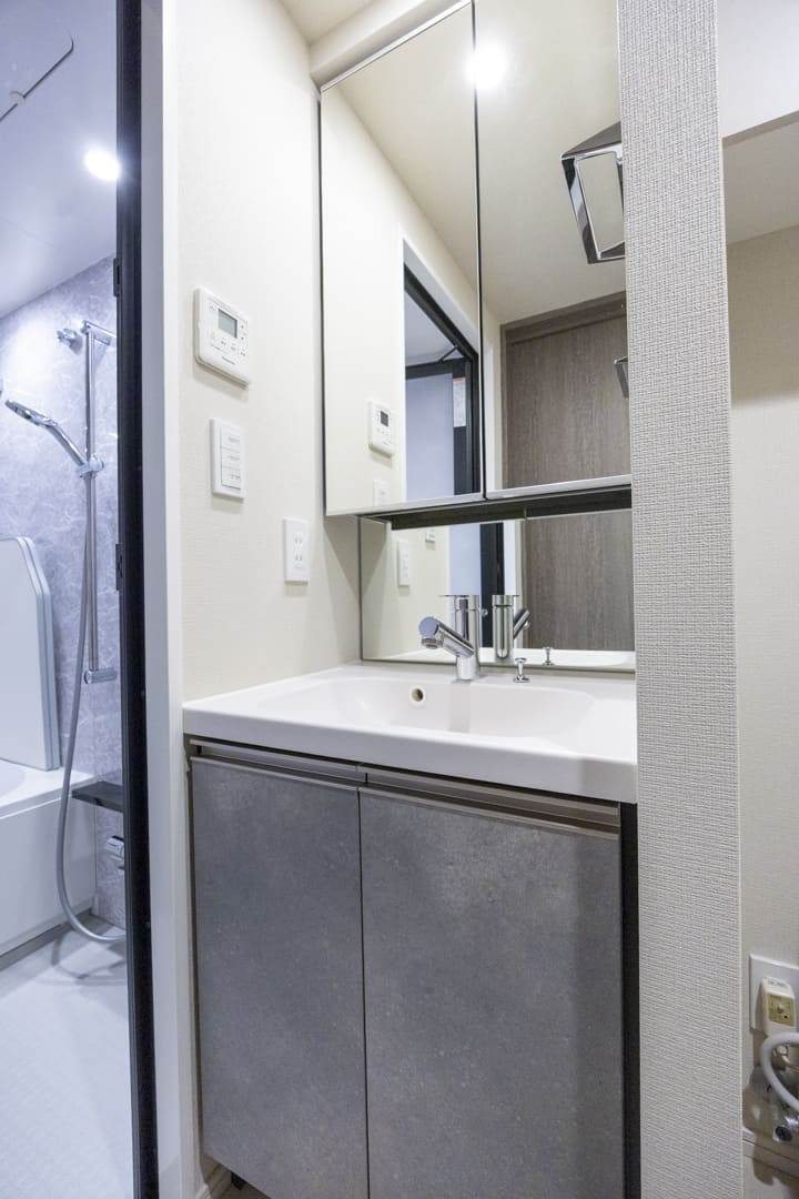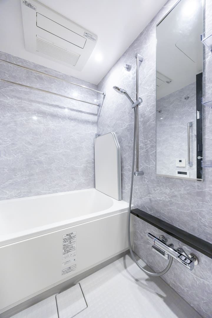 グレートーンでスタイリッシュな雰囲気が漂うバスルームです。お風呂にゆっくり浸かるのが好きという方に嬉しい追い焚き機能を搭載。浴室乾燥機には暖房・乾燥・換気・ミストサウナの機能がついており、一年中快適に過ごすことができます。