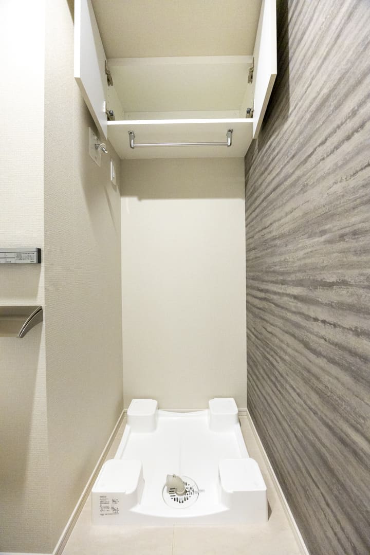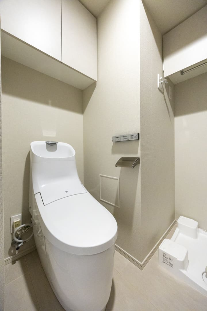 洗面室に設置されているトイレは、ウォシュレット一体型。上部には吊戸棚が設置されているので、トイレットペーパーや掃除用具などを収納することができます。