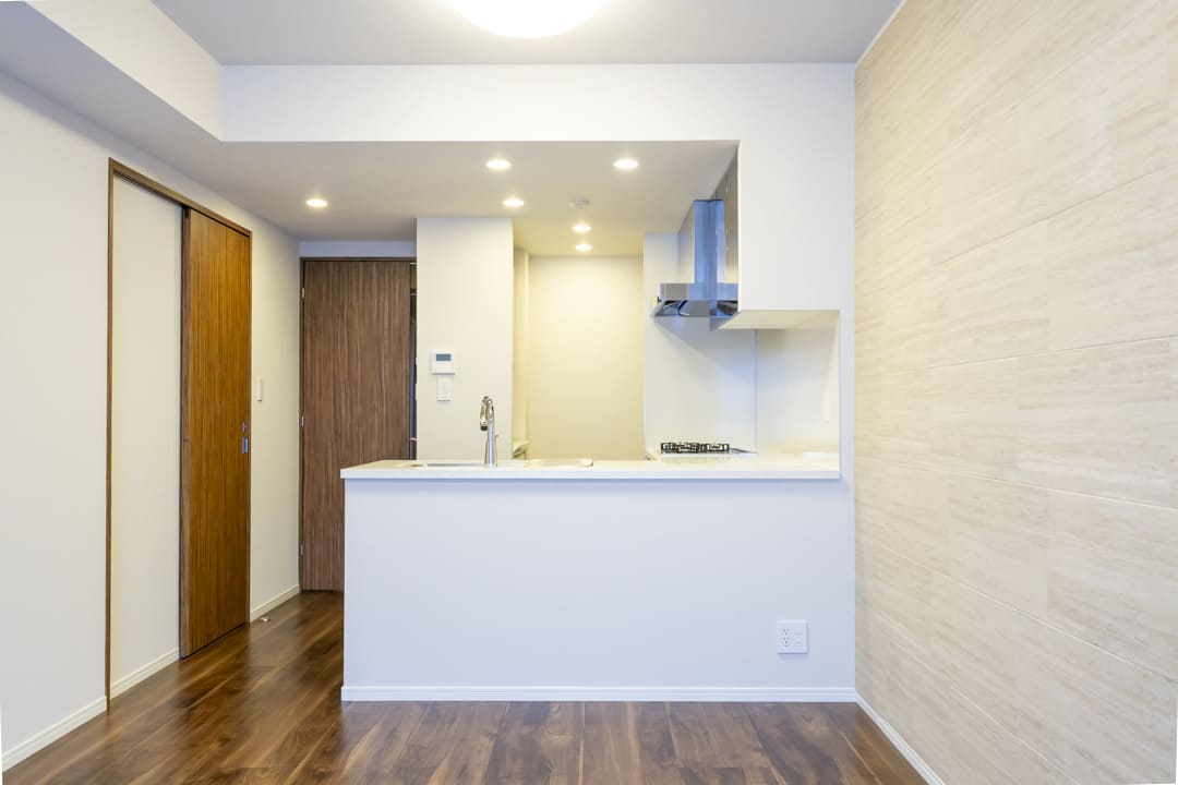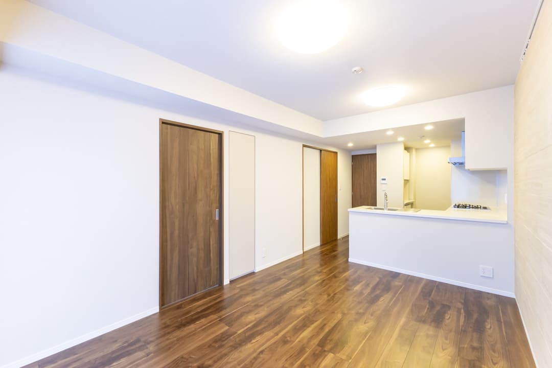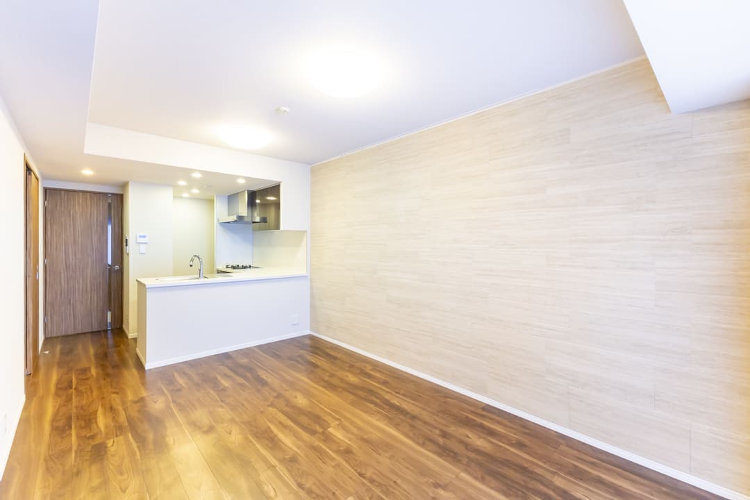 約13.5帖のLDK。南西向きの大きな窓から、心地よい光がたっぷり降り注ぎます。温もりある木目フローリングに石調のアクセントウォールが映え、上質な空間を演出。壁面にはピクチャーレールを設け、アートや写真をさりげなく楽しむことができます。