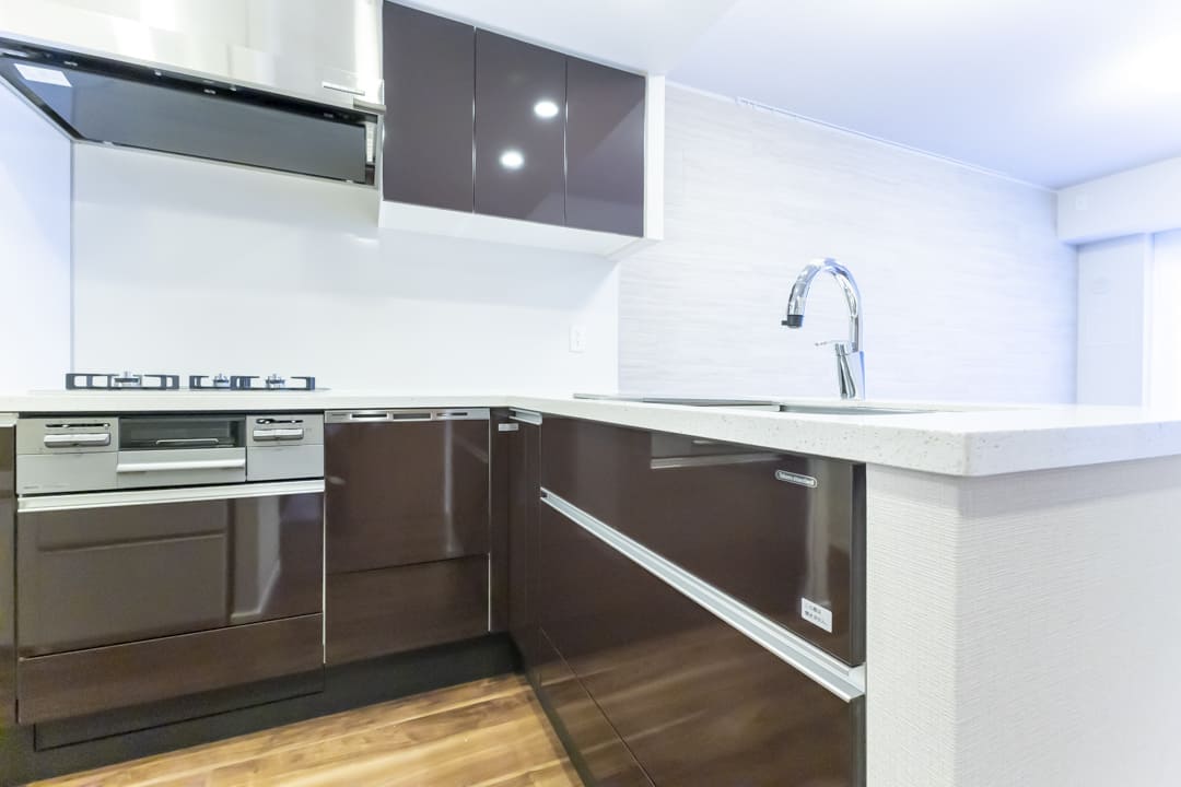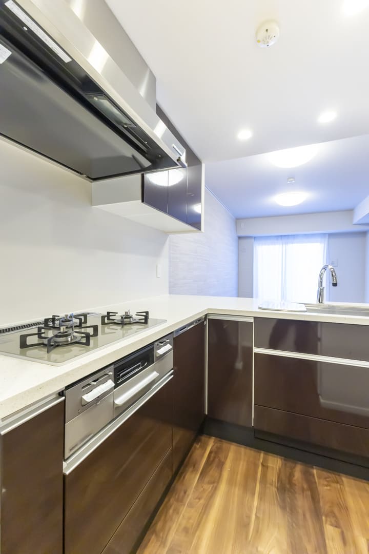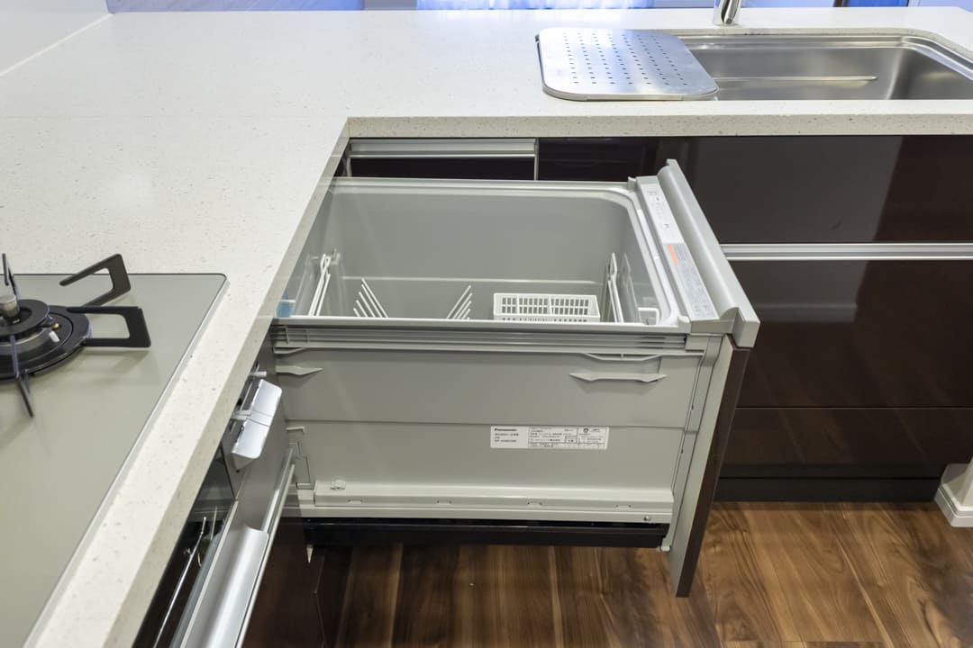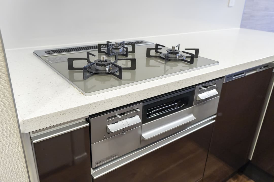 効率良く調理ができるグリル付3口ガスコンロを搭載。料理のレパートリーも増えそうです。さらに、食洗機が内蔵されているので、後片付けが捗り、節水効果も期待できます。