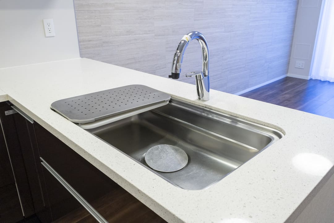 作業動線が短く、効率良く調理ができるL型キッチン。シンク側からはリビングダイニングを見渡すことができ、家族のコミュニケーションも取りやすい設計です。コンロ側は壁面仕様とし、油跳ねを軽減しながらリビング側をすっきりと保てるのも魅力。収納スペースもしっかり確保されています。