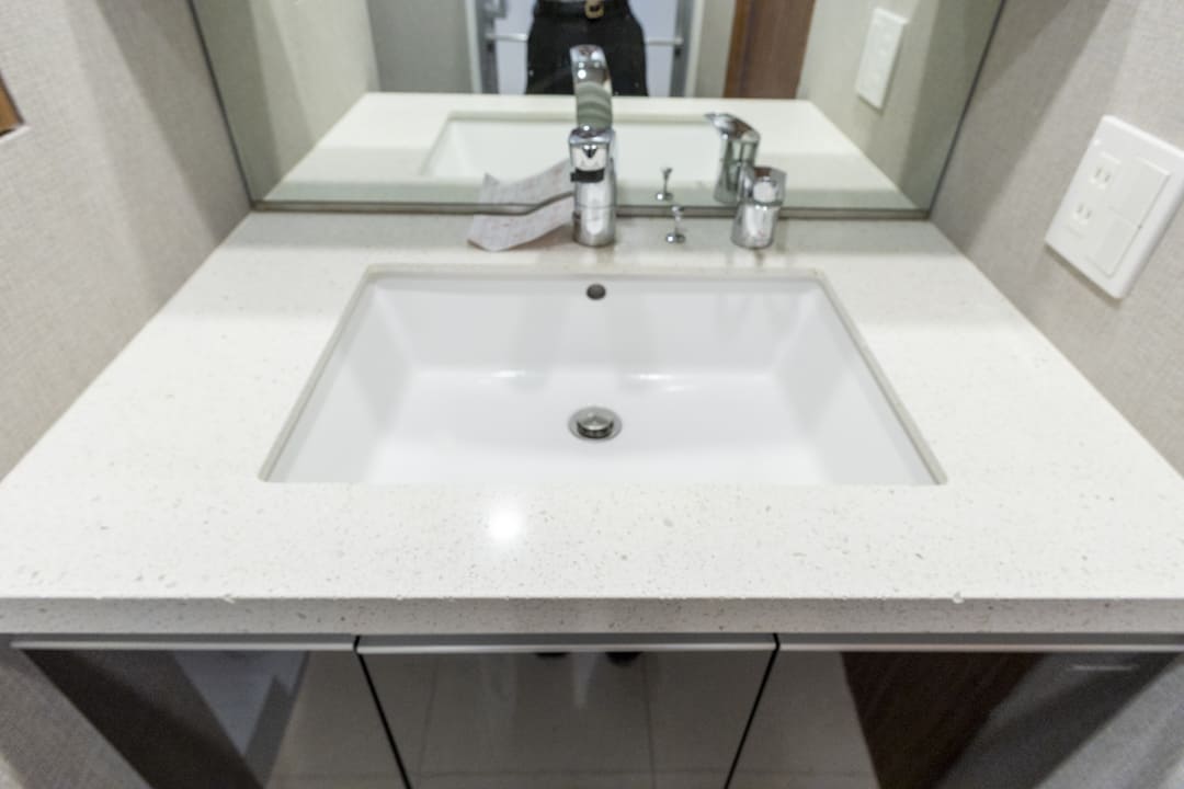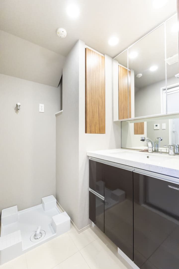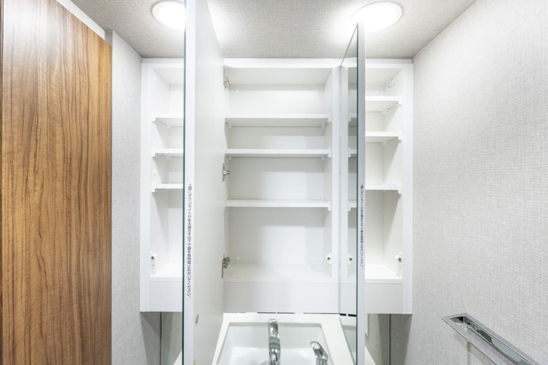 大きな三面鏡とミドルミラーを備えた洗面化粧台。身だしなみを整えるのに便利です。カウンターには化粧品やドライヤーを仮置きできるスぺースがあり、忙しい朝も安心。洗面まわりの小物はミラーボックスや可動棚に収納でき、いつも清潔な洗面室を保つことができます。
