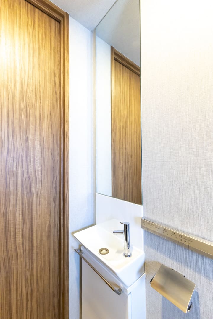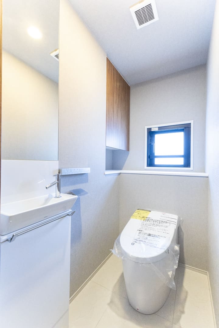 廊下に面していて独立性の高いレストルーム。窓付きで明るく、自然換気できるのも嬉しいポイントです。手洗いカウンター付きのためゲストを洗面室まで案内する手間がなく、さりげなく快適な使い心地を実感できます。背面にはトイレットペーパーの収納に便利な吊戸棚、ディフューザーやお花を置けるカウンターが設置されています。
