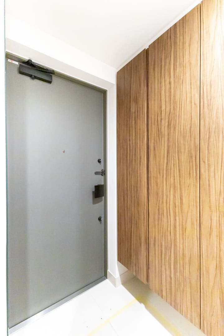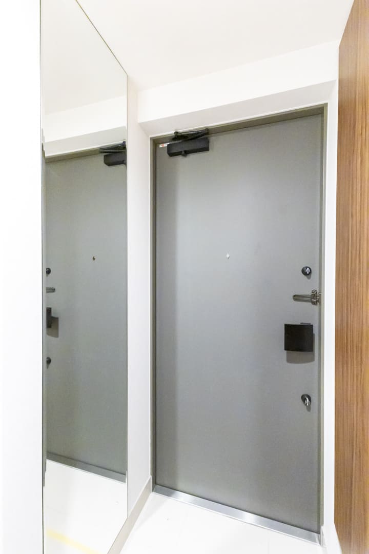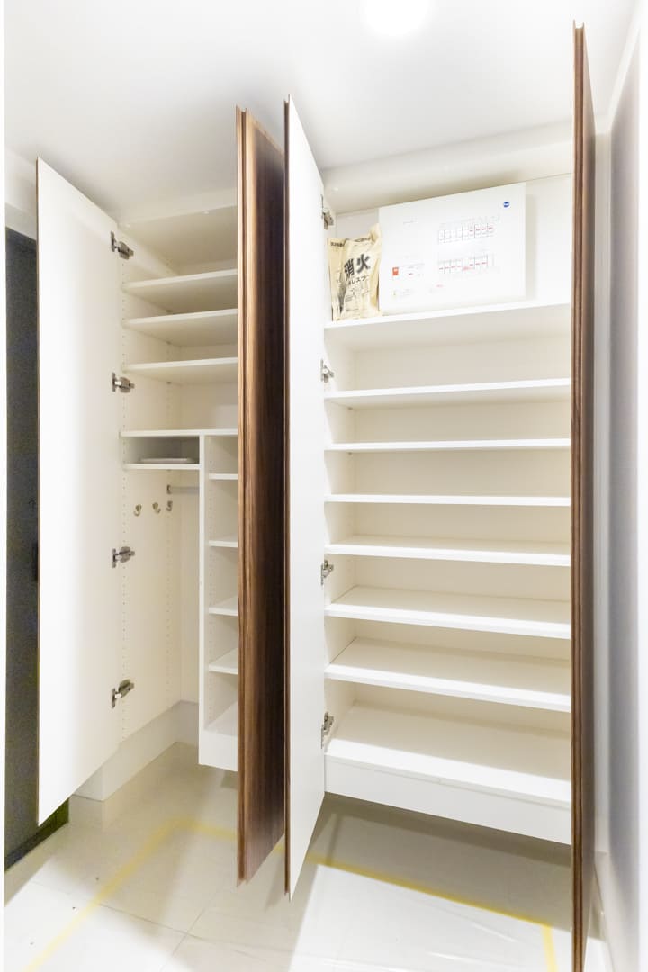 全身鏡が広がりをもたらす、スタイリッシュな玄関スペース。靴を履いた状態でコーディネートチェックができるのも嬉しいポイントです。トールタイプのシューズボックスを備え、収納充実。靴はもちろん、雨具なども収納でき、すっきりとした空間をキープできます。