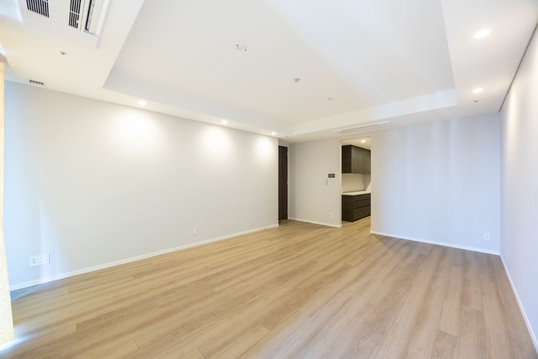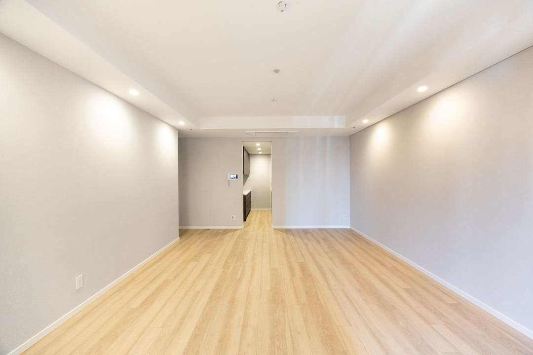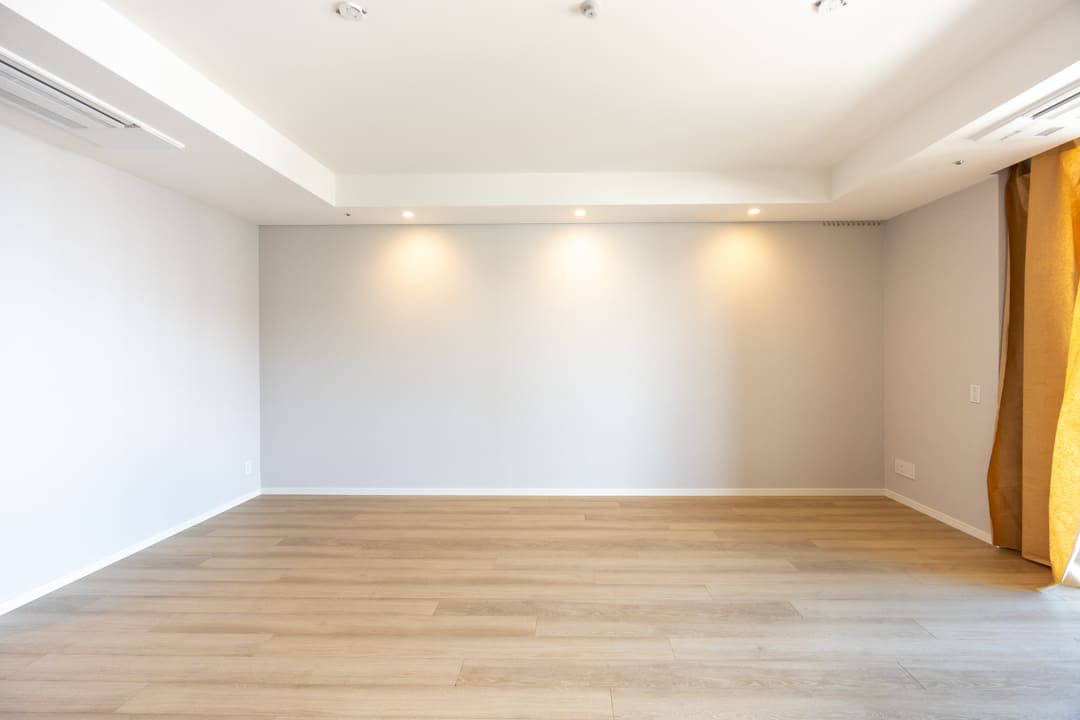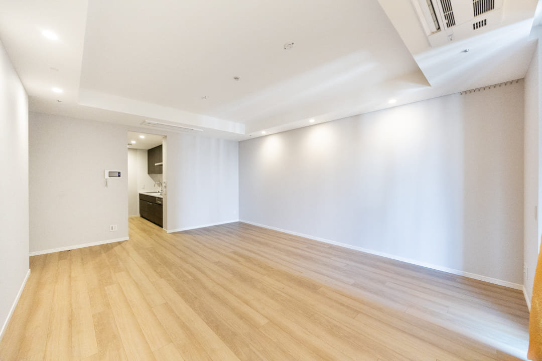 約16.2帖で大きめの家具が配置できる広々としたリビングダイニングです。壁面にはピクチャーレールが設置されているので、壁を傷つけずに絵画やグリーンなどを飾ることができます。また、エアコンは埋め込み式のためインテリアの邪魔をしないのも◎。