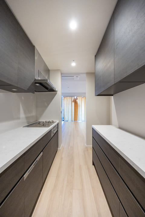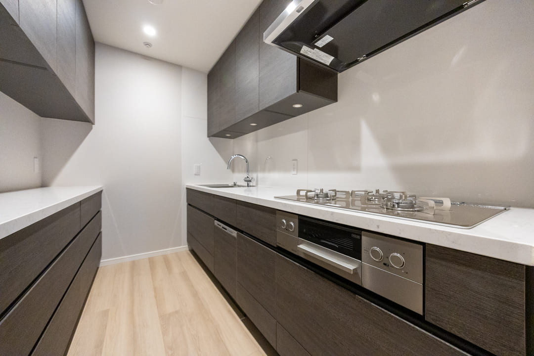 キッチンは、生活感が出やすいキッチンまわりをさりげなく目隠しすることができる独立キッチンです。ダークカラーの面材で、洗練された雰囲気を漂わせています。