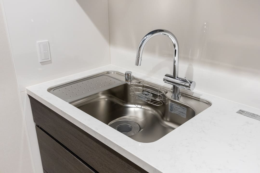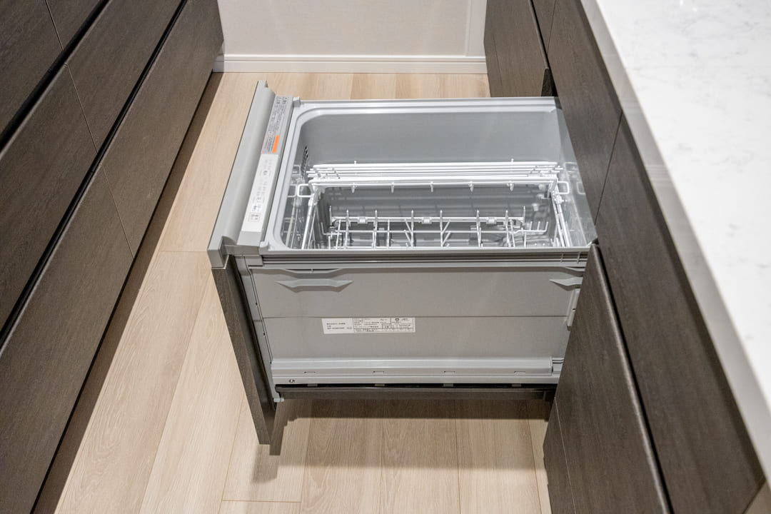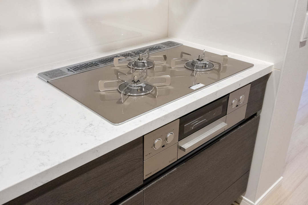 3口コンロ、グリル、ディスポーザー、食洗機付きと設備面も充実しています。作業スペースには、コンセントがあるので、ミキサーなどのキッチン家電も使いやすそうです。
