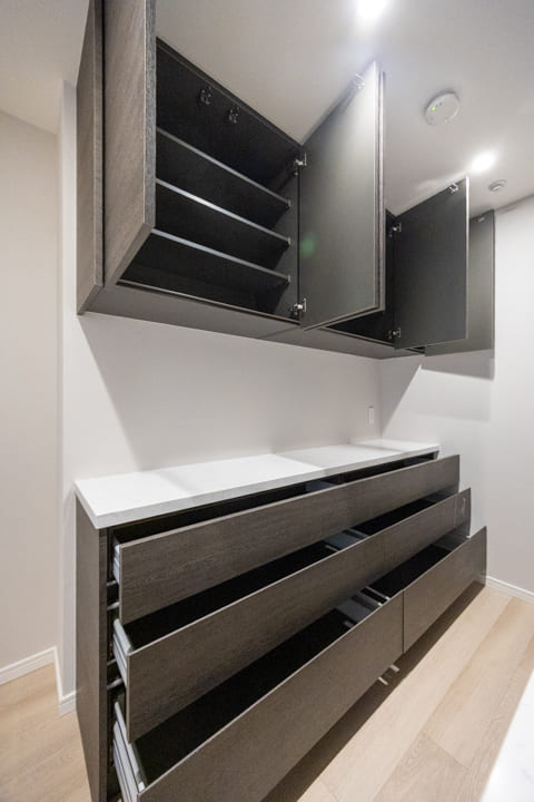 キッチンの背面側にはカップボードが備え付けられています。調味料や食器などを収納できるだけでなく、電子レンジなどを置くこともできるので便利です。