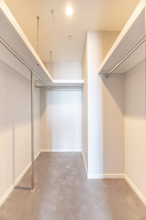 約11.4帖の主寝室は、落ち着いて過ごせる広さが確保された空間。カーペットが敷かれたやわらかな足触りに加え、床暖房を備えており、足元から穏やかなぬくもりを感じられます。壁面にはピクチャーレールが設けられ、お好みのアートや写真を気軽に飾ることが可能です。さらに、奥行きのあるウォークインクローゼットを備え、衣類や荷物をまとめて整理しやすい設えとなっています。