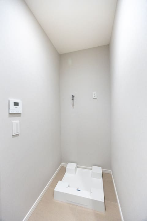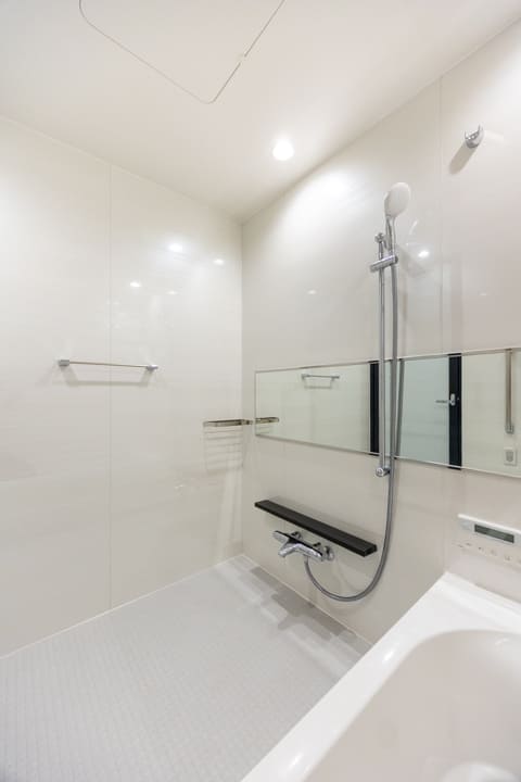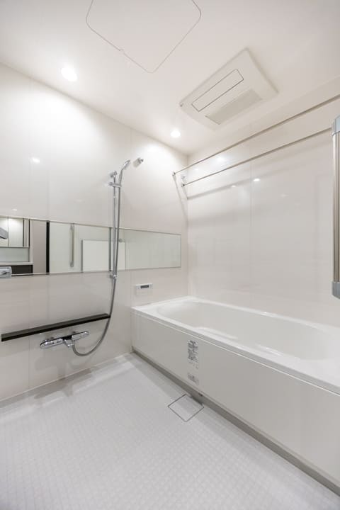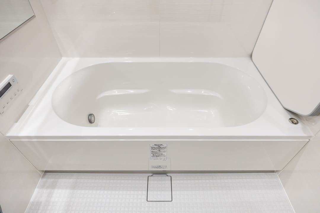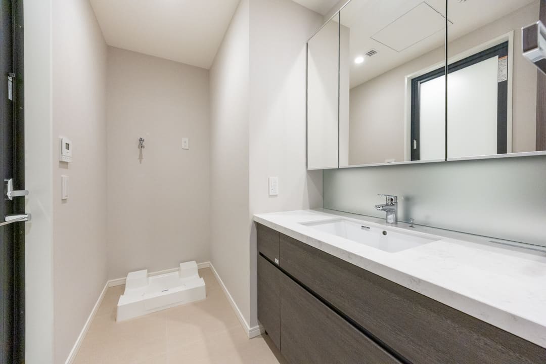 ブラックのカウンターが空間を引き締め、落ち着いた雰囲気を演出するバスルーム。湯温を保てる追い焚き機能を備えており、入浴のタイミングが異なる場合でも心地よい状態で利用できます。さらに、浴室乾燥機には暖房・乾燥・換気・ミストサウナを搭載。季節を問わず使い勝手に配慮された設備が整っています。