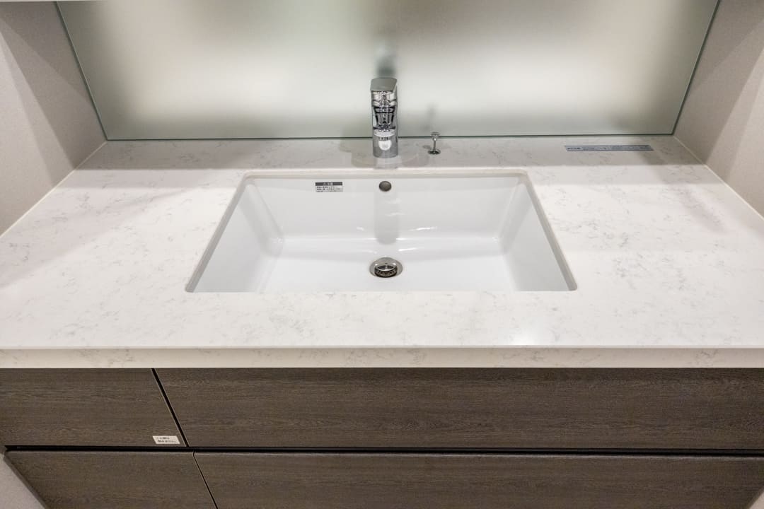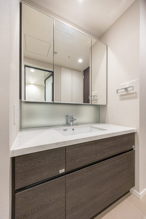 石目調のカウンターで高級感がある洗面化粧台です。三面鏡の中は化粧品などが収納できるようになっていて使い勝手良好。背面側には棚が造られているので、ごちゃごちゃしがちな洗面まわりをきちんと整頓させることができます。