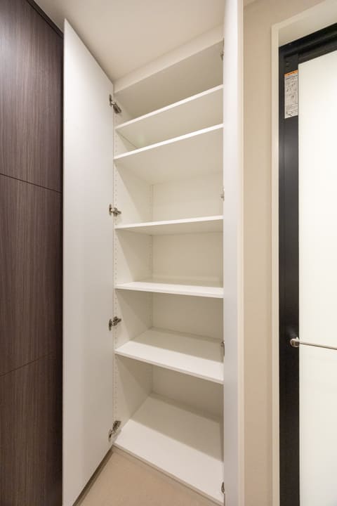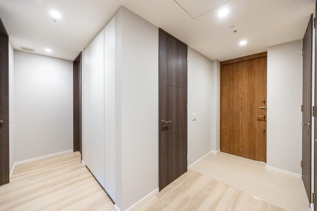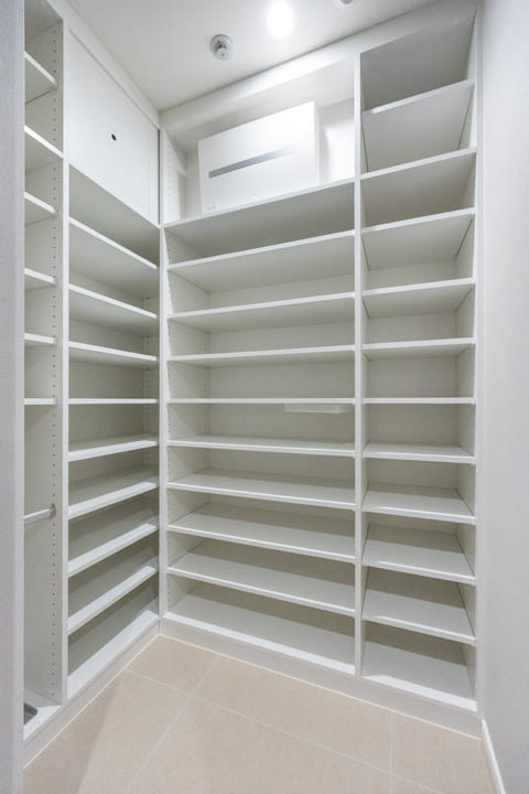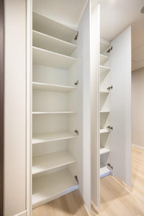 荷物を持っていても出入りがしやすそうなゆとりのある玄関です。入って左側にはシューズインクローゼットがあり、たくさんの靴を収納することができますよ。また、廊下には納戸や棚が造られているので、生活感が出がちな荷物も収納が可能。居住スペースをより有効的に使えるので嬉しいですね。