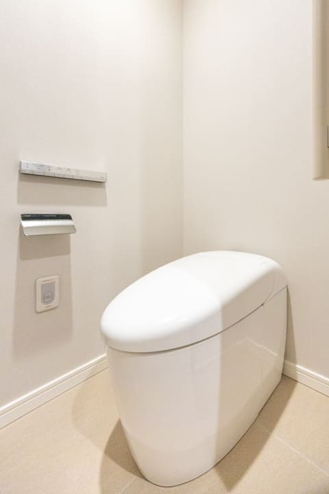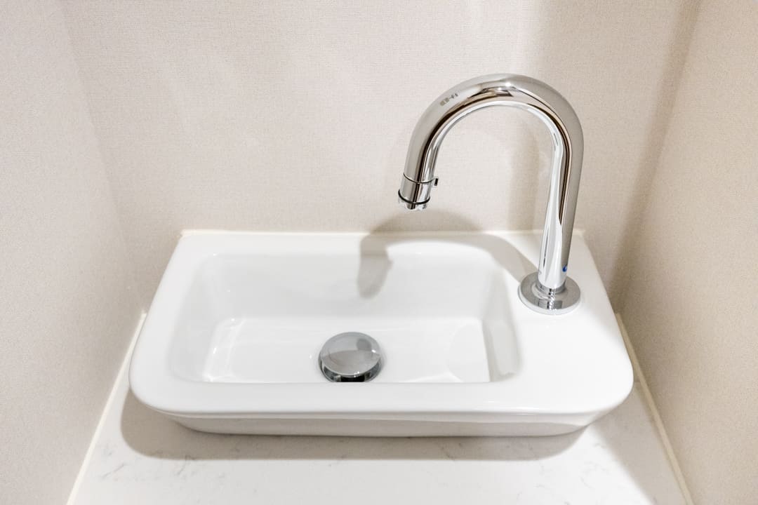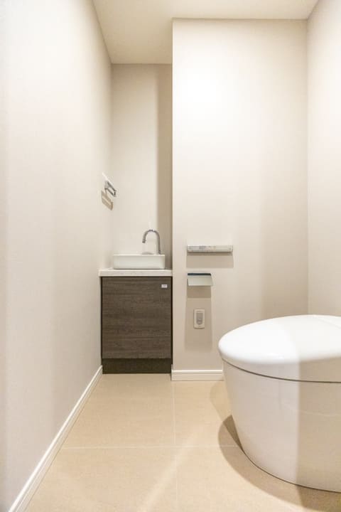 ウォシュレット一体型のトイレを採用し、タンクレス仕様ならではの軽やかな空間に仕上がっています。圧迫感を抑えた設計で、空間全体がすっきりと整った印象に。さらに独立した手洗いカウンターが設けられており、動線もスムーズ。使用後すぐに手を清潔に保てる点にも配慮されています。