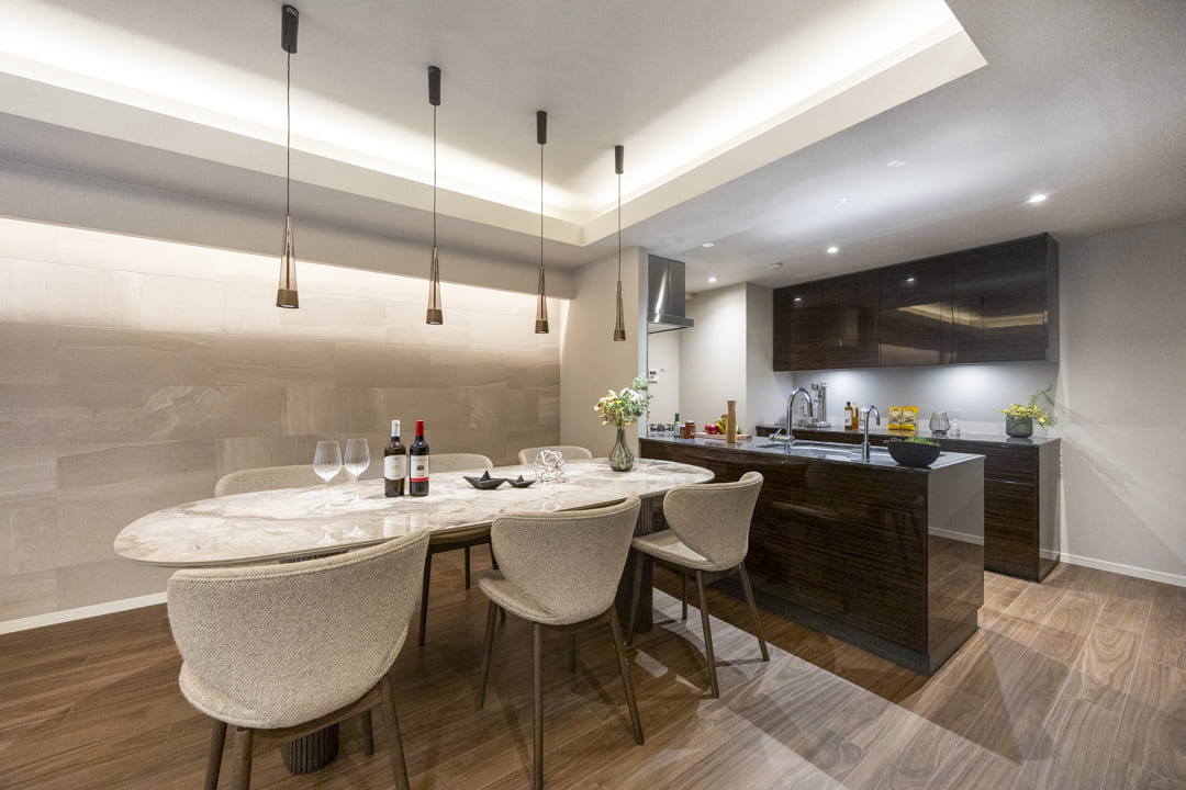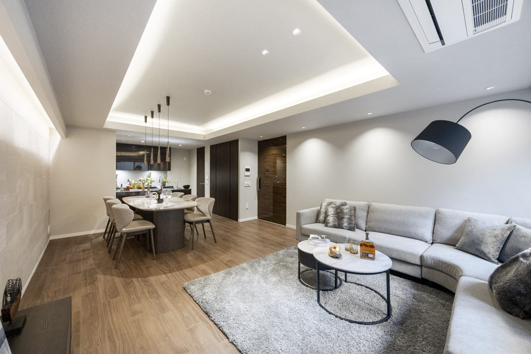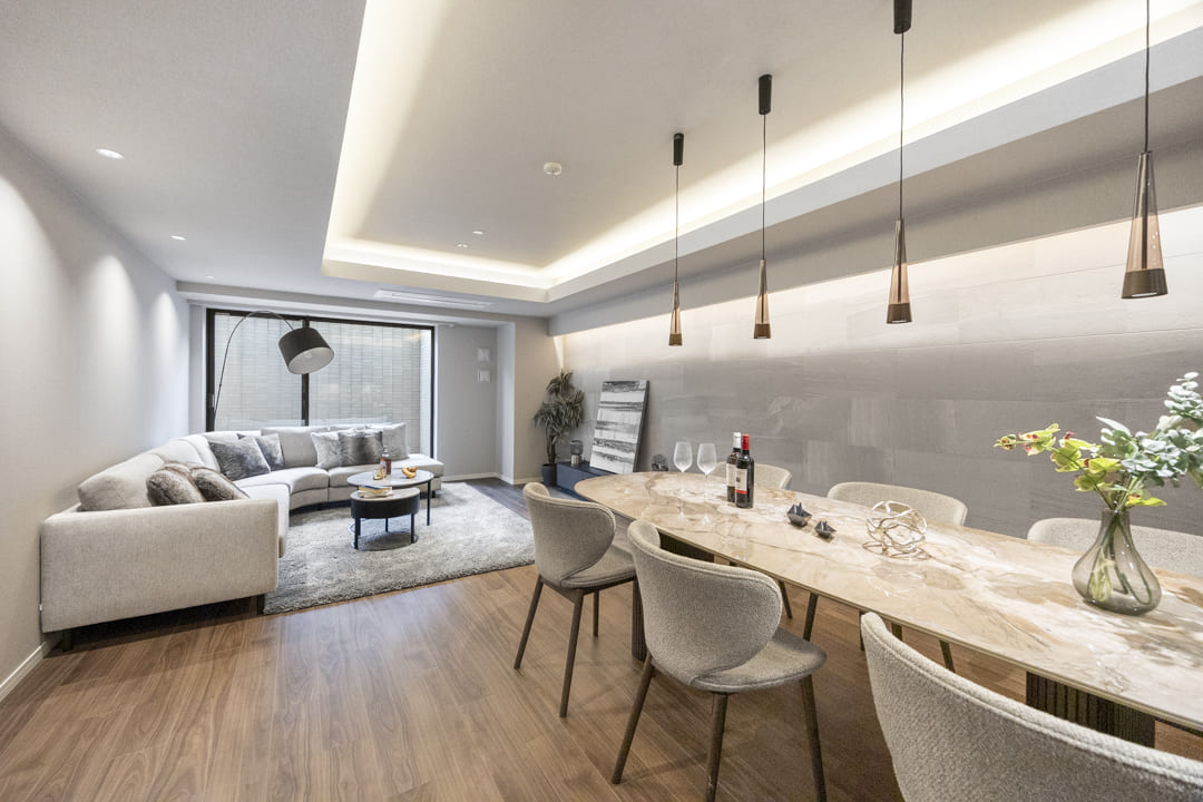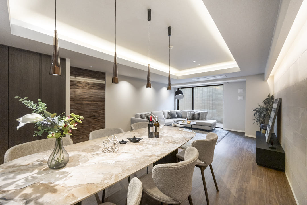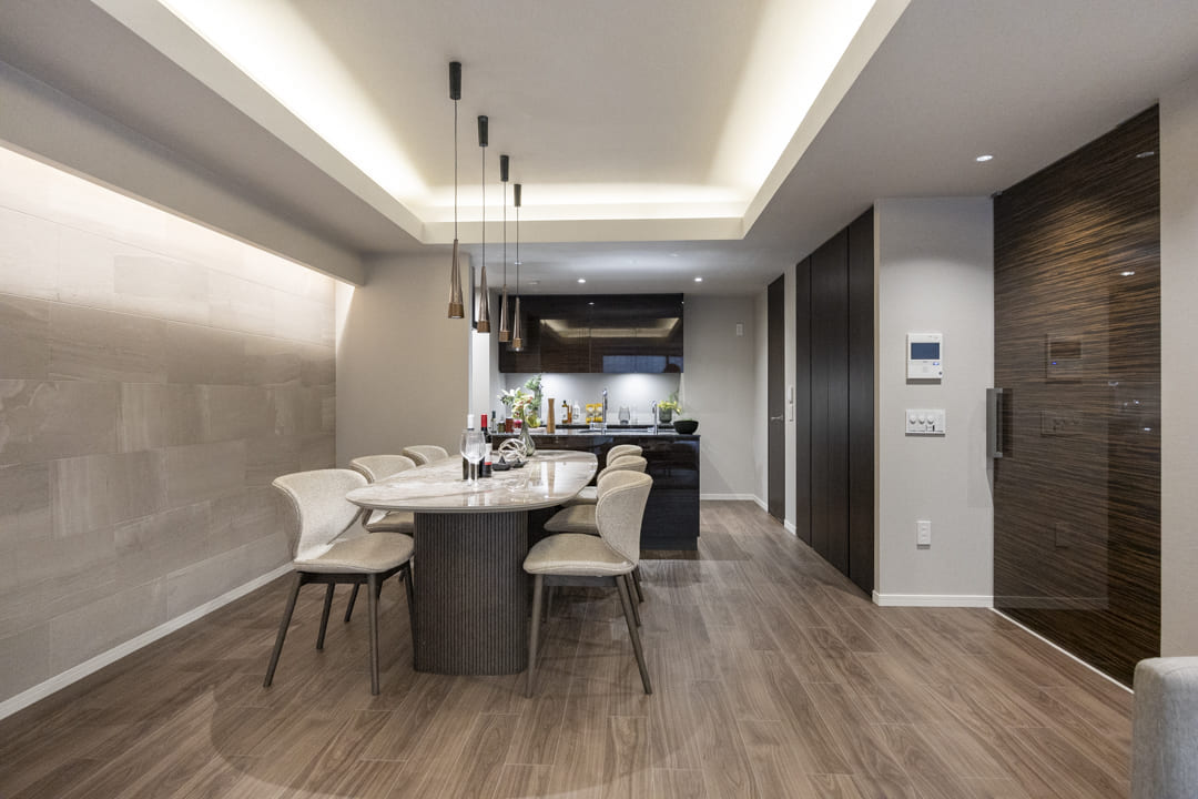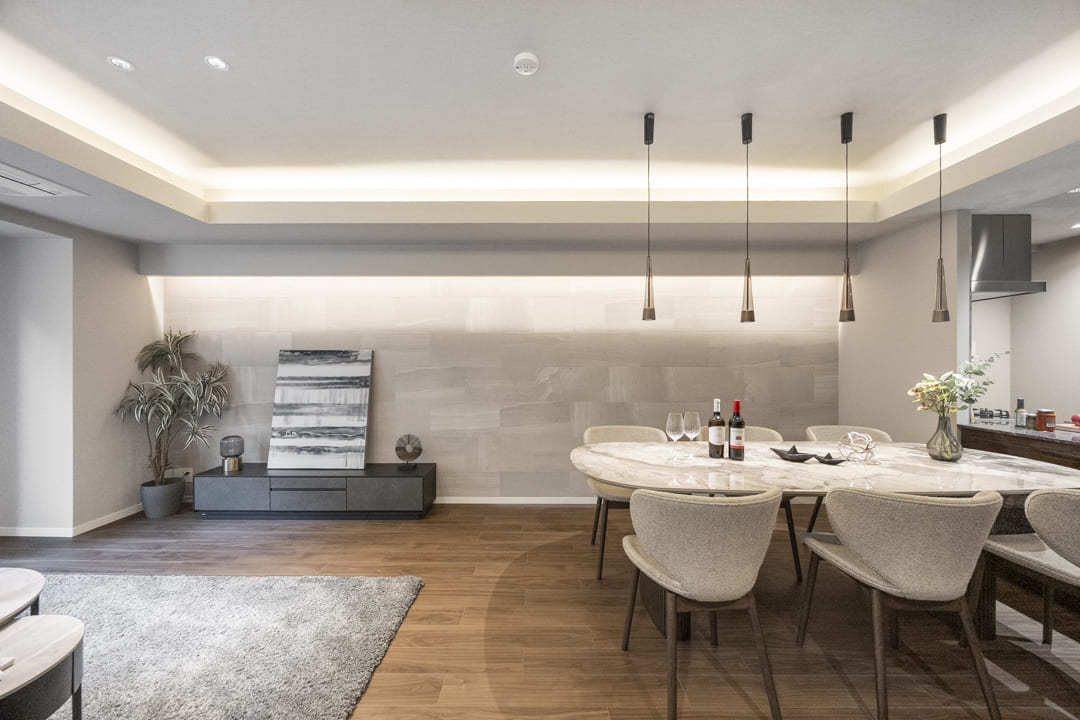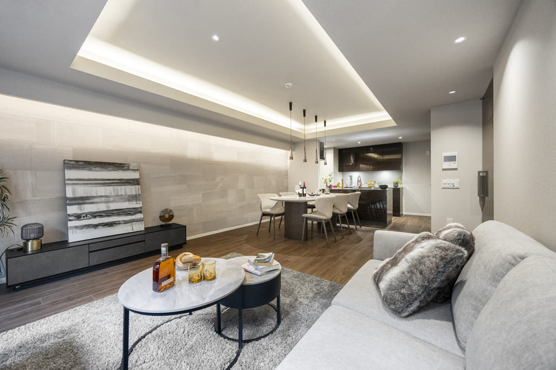 約22.7帖のゆとりあるLDK。東向きの窓からやわらかな陽光が差し込みます。温もりある木目フローリングに、石調のアクセントウォールが映える洗練された内装。さらに間接照明のやわらかな光が室内を包み込み、穏やかで落ち着いた時間を演出します。ゆったりと寛ぎながら、上質なひとときを過ごせる空間です。