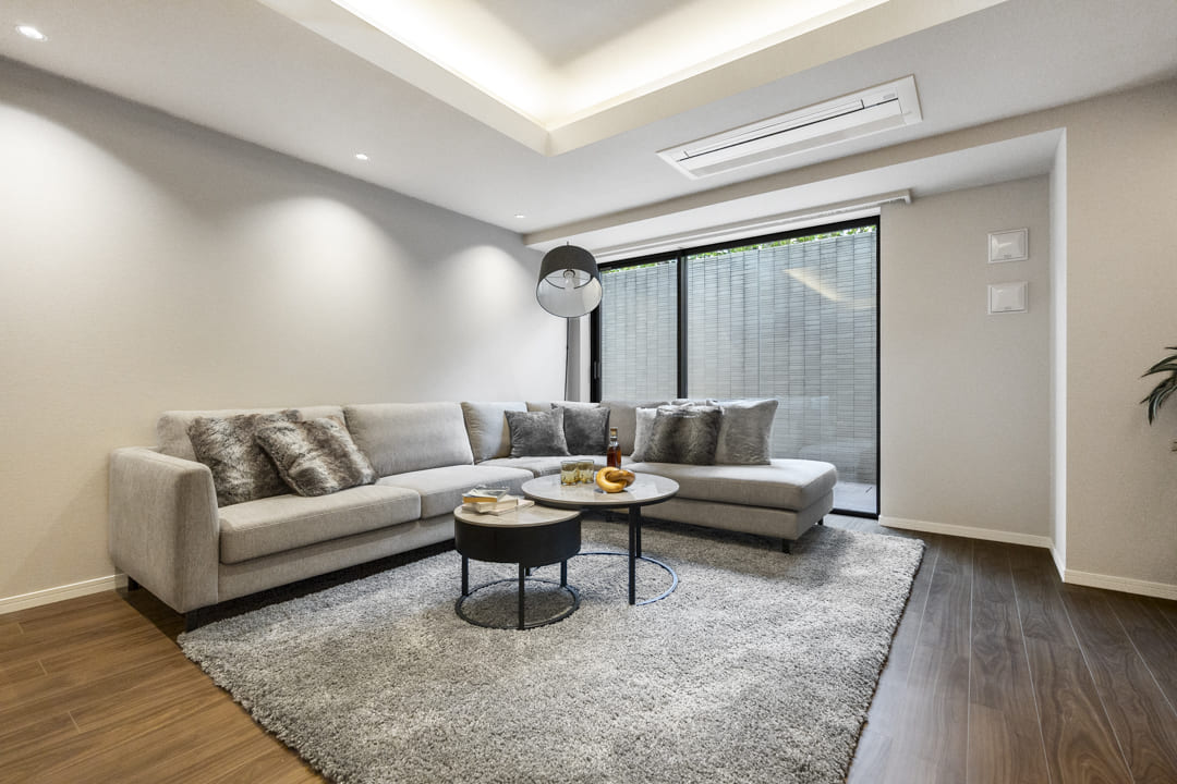 寒い季節に重宝する床暖房を備え、足元からやわらかく室内を暖めます。床全体が均一に温まりやすく、埃を舞い上げにくい点も特徴。空気が乾燥しにくく、直接火を使わないため、小さなお子さまのいるご家庭にも配慮された仕様です。さらに、ビルトインエアコンを設置し、生活感を抑えながら室内全体を快適に保つことができます。