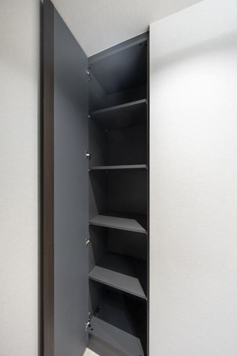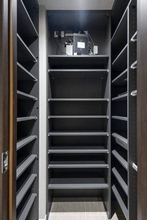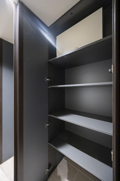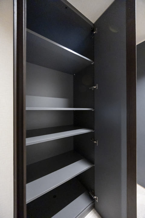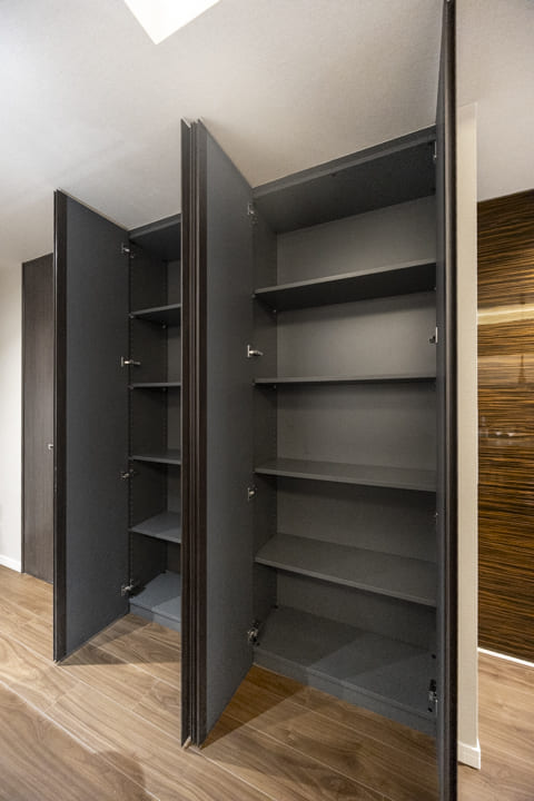 天井まで高さのある扉付き収納を備えた、使い勝手の良い設計。可動棚仕様のため、生活用品や書類から掃除機などの高さのある荷物まで、すっきりと整理できます。生活感をさりげなく隠せる“見せない収納”で、洗練された室内を美しく保てます。
