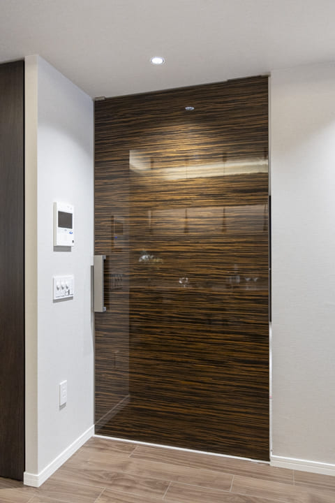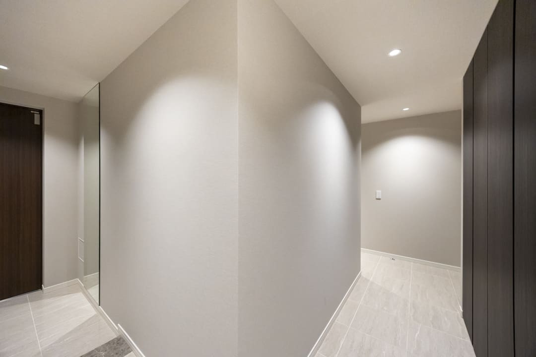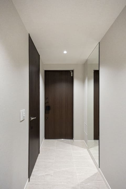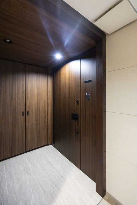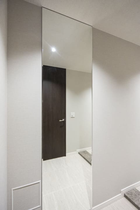 人感センサー照明を備えた玄関。帰宅時にはやわらかな光が自動で灯り、住まいへとやさしく迎え入れてくれます。荷物で両手が塞がっている時や夜遅い帰宅時にも、スイッチを探す手間がなくスムーズに出入り可能。全身鏡が奥行きを感じさせ、上質な雰囲気を演出します。お出かけ前の身だしなみチェックにも便利です。SIC(シューズインクローゼット)を備え、靴はもちろん雨具やアウトドア用品などもすっきり収納可能。さらに廊下収納も設けられており、日用品やストック類などの整理にも重宝します。