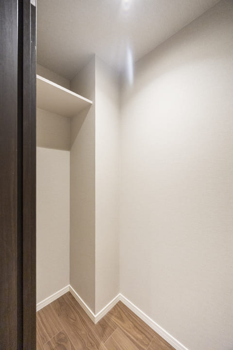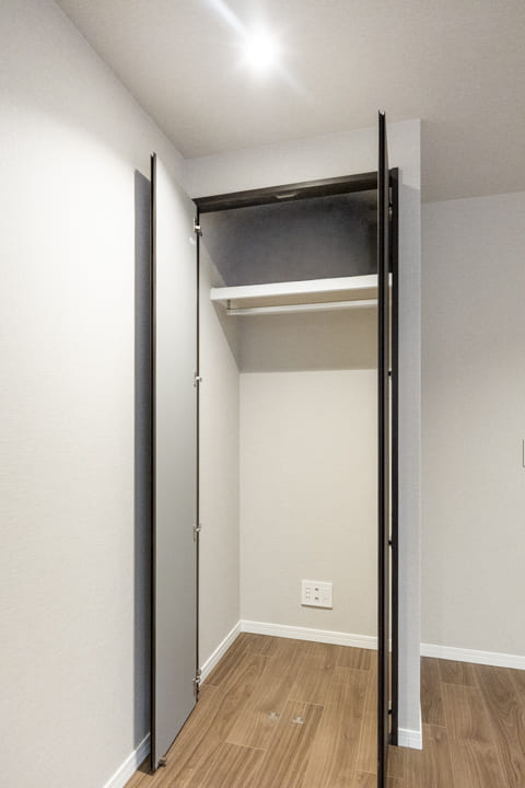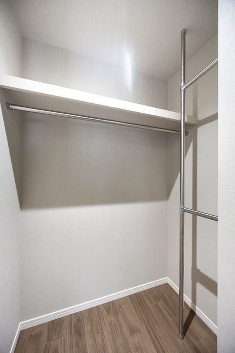 約1.4帖のWIC(ウォークインクローゼット)を備え、収納力も充実。衣類はもちろん、トランクケースや季節家電などの大きな荷物もすっきりと収まり、居室空間を有効に活用できます。ハンガーパイプは上下2段仕様となっており、丈の短い衣類を効率よく収納できるのも嬉しいポイントです。