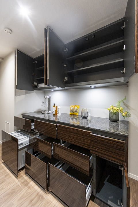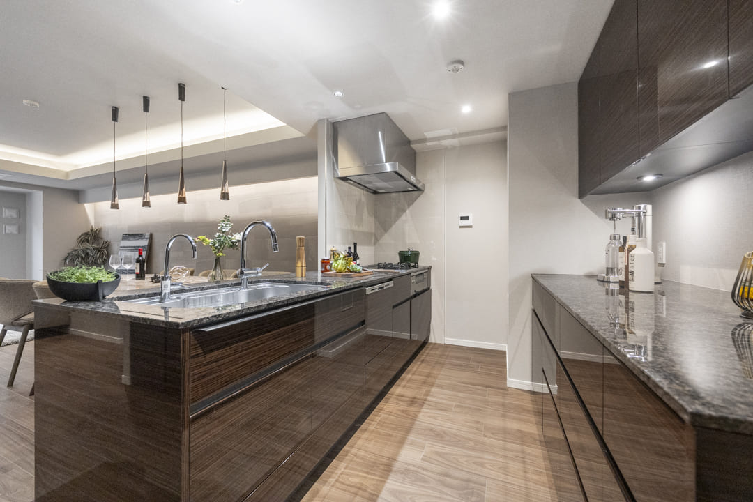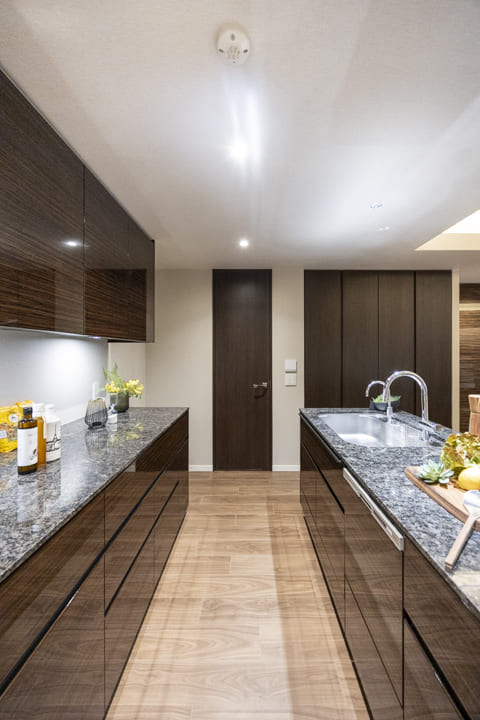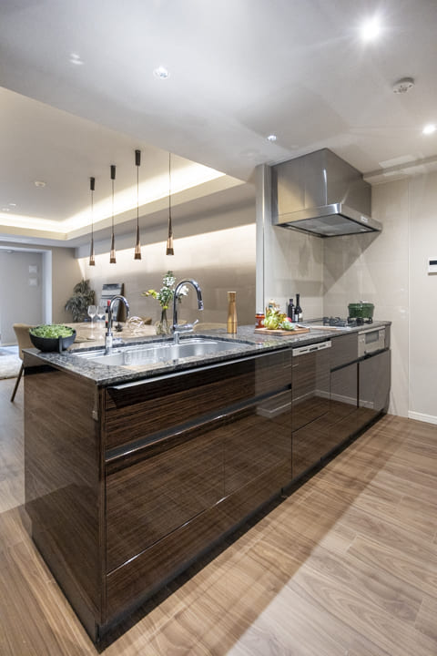 ダークカラーの木目デザインが重厚感を演出するキッチン。リビングダイニングを見渡せる開放的な対面タイプです。料理をしながら家族との会話も自然と生まれ、暮らしのコミュニケーションを豊かにしてくれます。コンロ側は壁面仕様となっており、油跳ねを軽減し、リビング側をすっきりと保てる点も魅力です。
