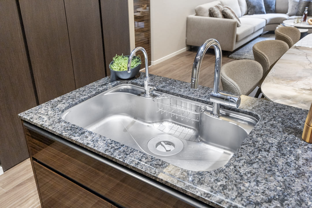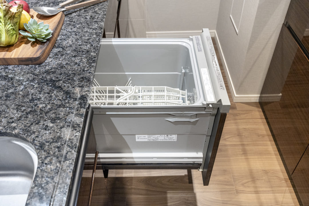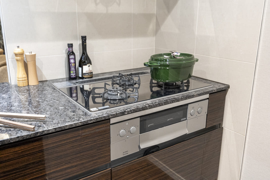 同時調理が叶うグリル付3口ガスコンロを内蔵。さらに、ディスポーザーと食洗機も完備されています。料理後すぐに生ゴミを処理できるので、悪臭の原因を防ぎ、掃除の手間を軽減。食器洗いも捗り、後片付けの時短が叶います。