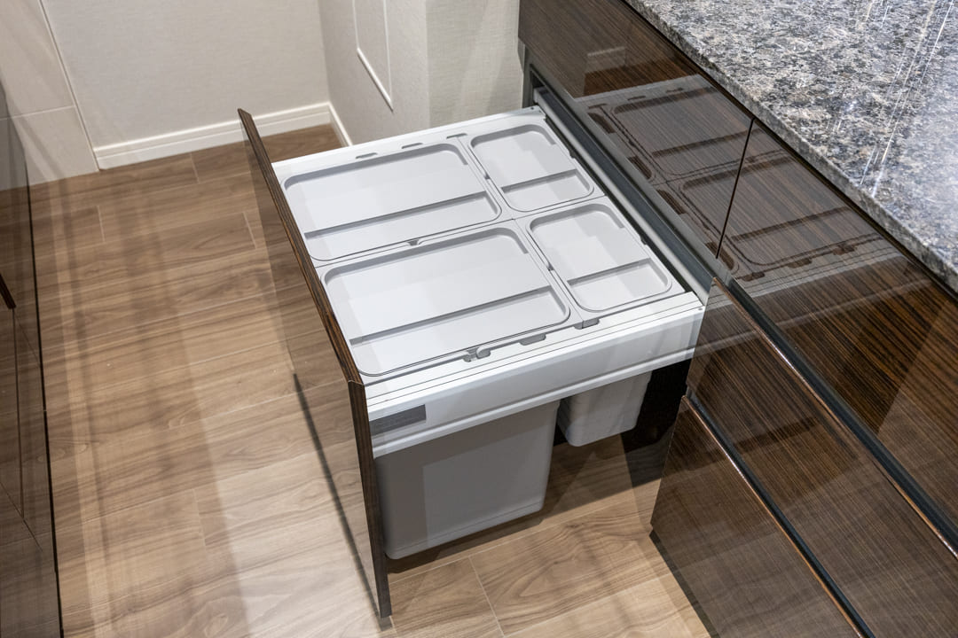 背面にはキッチンとデザインを揃えたカップボードを設置。統一感のある美しい空間を保ちながら、食料品や食器類をすっきりと収納できます。ワゴン式のダストボックスにより、生活感を抑えながら使えるのも魅力です。さらに、約0.8帖の物入も備えており、使用頻度の低いキッチン家電や飲料水などのストック類の保管にも便利です。