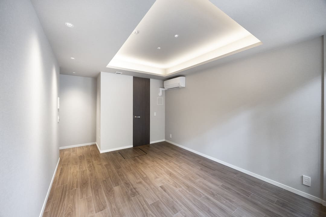 約9.0帖のゆとりある主寝室。東側の大きな開口部からはやわらかな朝日が差し込み、穏やかな一日の始まりをもたらします。折り上げ天井に設けられた間接照明がやさしく灯り、落ち着きのある上質な寛ぎの時間を演出します。
