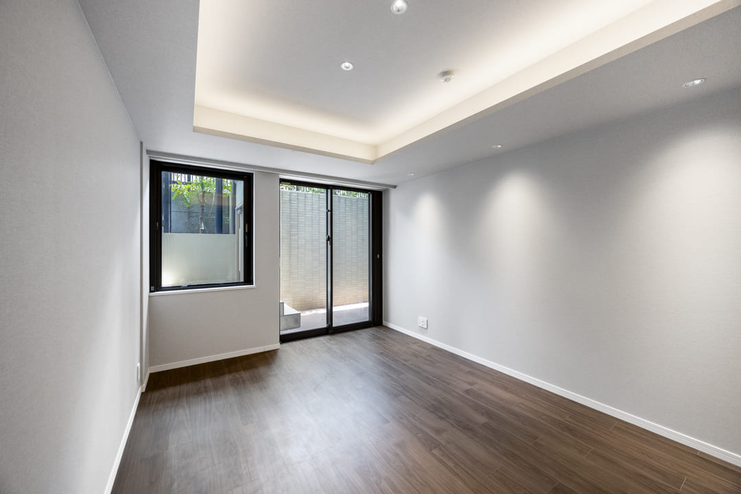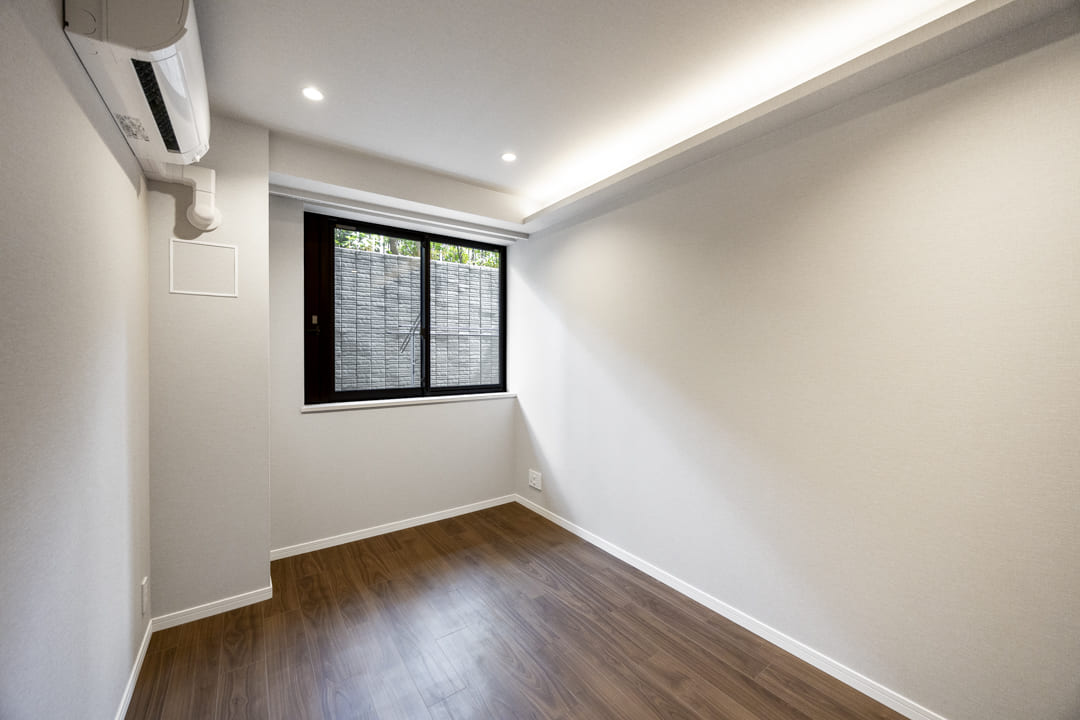 お隣にあるのは約5.6帖の寝室2。東向きの窓から心地よい光と風が届きます。間接照明がやわらかな陰影を生み、落ち着いた雰囲気を演出。寝室としてはもちろん、ワークスペースや趣味のお部屋など、ライフスタイルに合わせて柔軟に活用できる一室です。