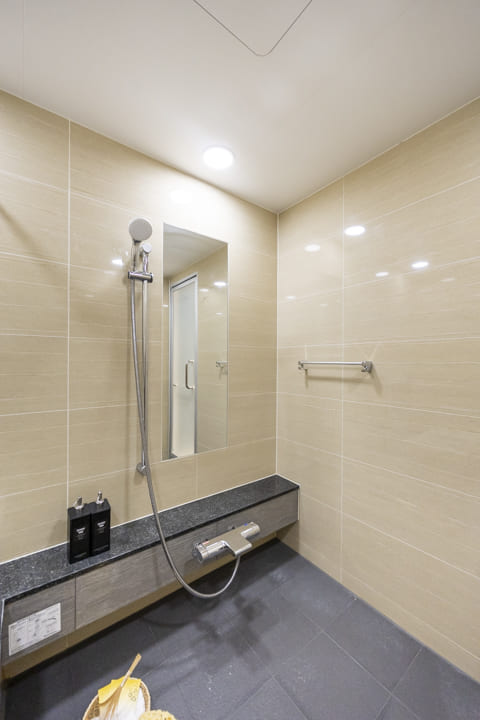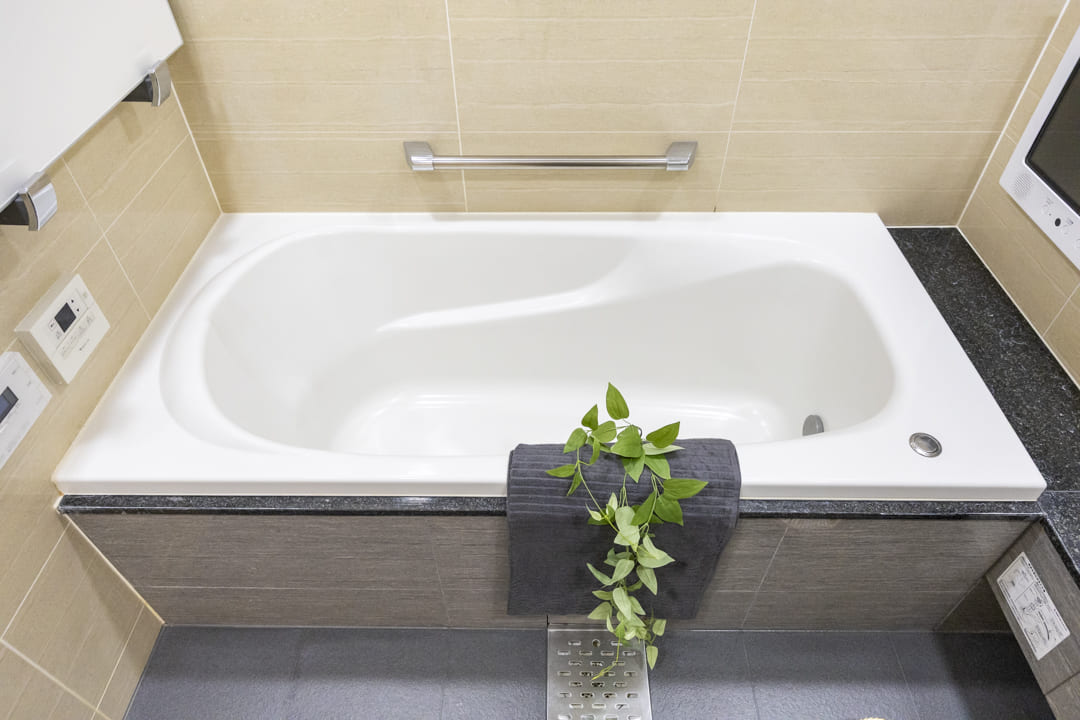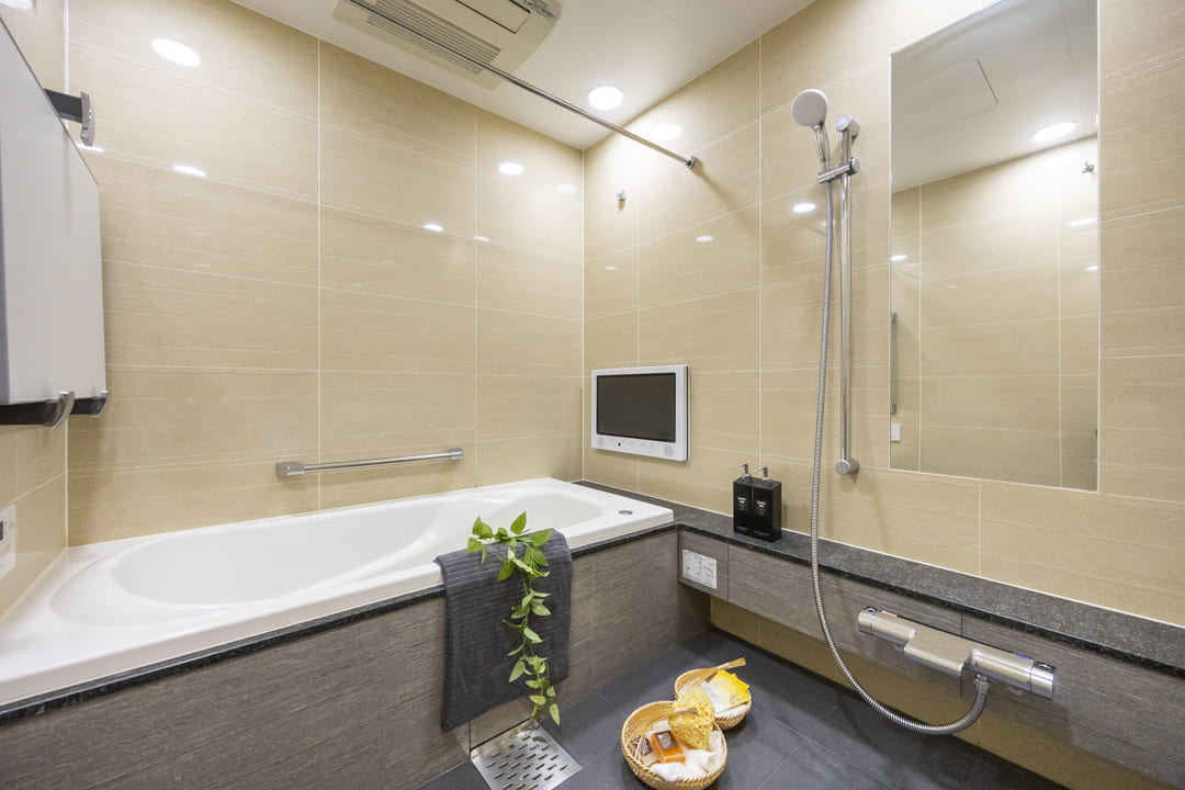 タイル調のデザインが上質感を演出するバスルーム。浴室換気乾燥暖房機や追い焚き機能に加え、ミストサウナを搭載しています。さらにテレビも備わっており、湯に浸かりながらゆったりとしたリラックスタイムをお過ごしいただけます。発汗によるリフレッシュやボディケアなど、日々の疲れを癒すバスタイムを叶えてくれます。