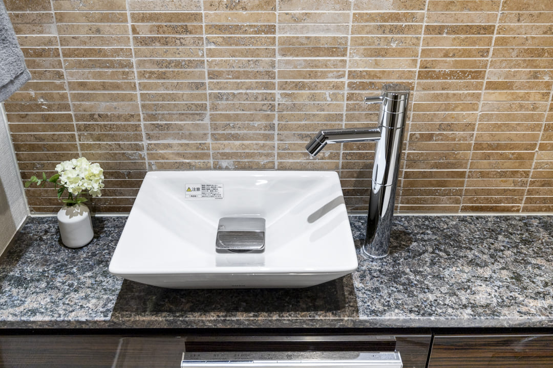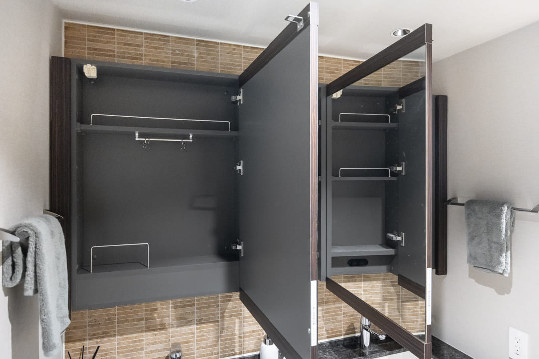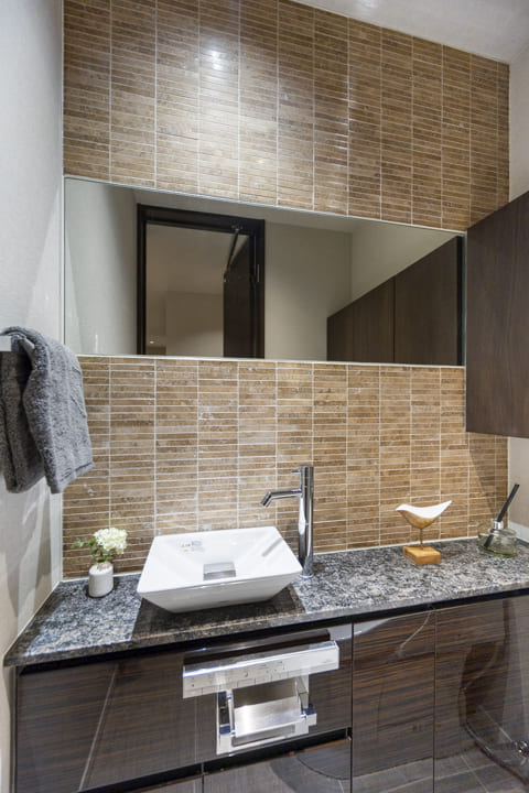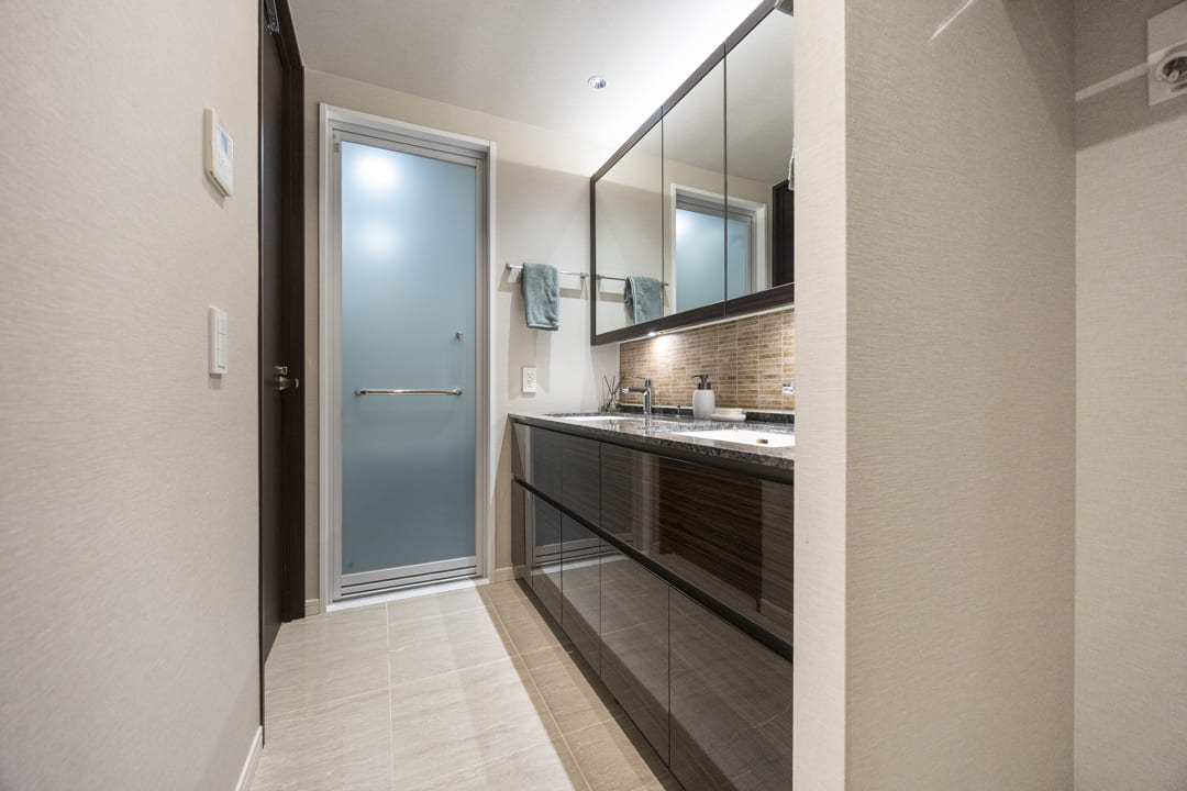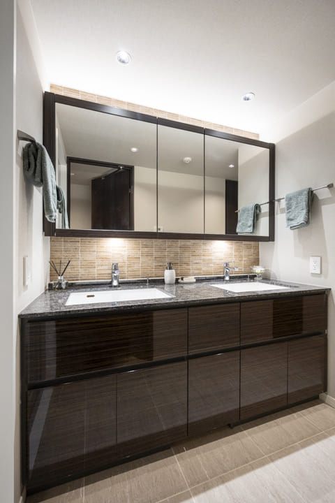 石調カウンターやウッド調のデザインが高級感をもたらす洗面化粧台。2ボウル仕様のため、忙しい朝の身支度にもゆとりが生まれます。大容量のミラーボックスに加え、足元の引き出しやリネン庫も備わり収納も充実。洗面まわりの小物からタオル・パジャマ類まで美しく収まり、すっきりとした空間を保つことができます。