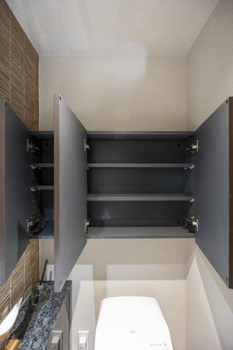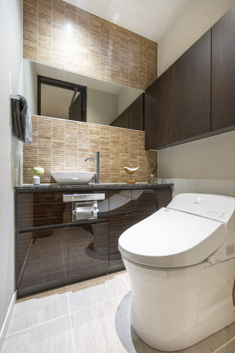 タイルデザインの手洗いカウンターを設けた、ホテルライクなレストルーム。来客時にもスマートにお使いいただけます。トイレはスタイリッシュなタンクレスタイプを採用。トイレットペーパーなどの生活感の出やすい備品は吊戸棚にすっきりと収まり、空間を美しく保てます。人感センサー照明を備えており、消し忘れの心配がないのも嬉しいポイントです。
