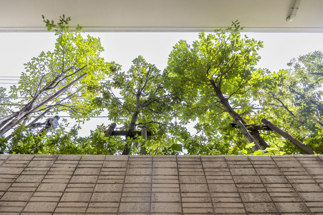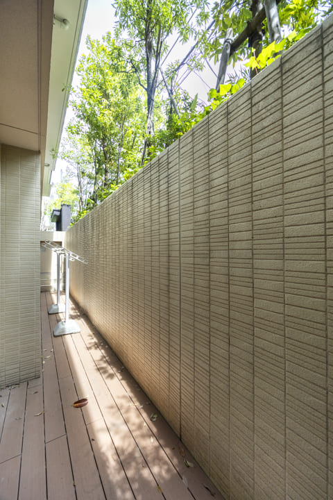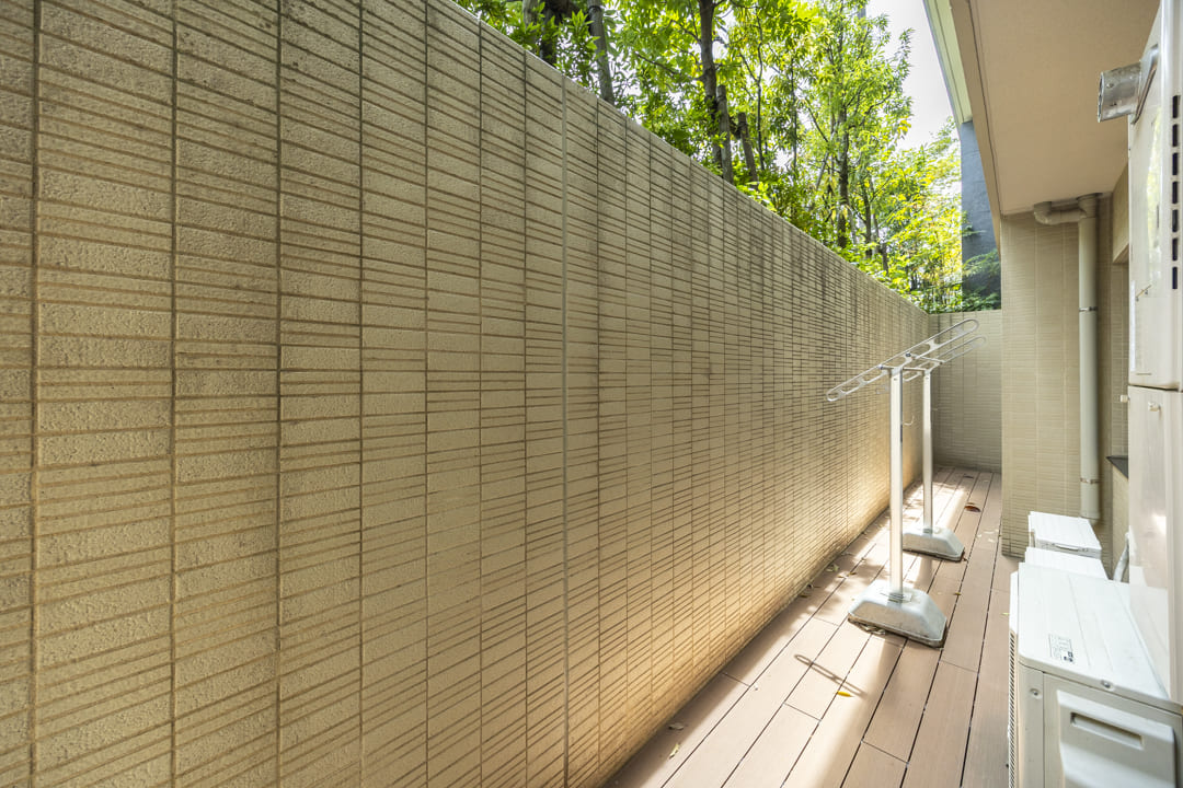 東向きに設けられたドライエリアテラス。17.86㎡のゆとりあるワイドな広さを備えています。1階部分のため前面は壁になっていますが、外部からの視線を気にしにくく、落ち着いて過ごせるプライベート感のある空間です。上部からやわらかな陽光が差し込み、朝のストレッチや日中のリラックスタイムなど、気軽に外の空気を感じられる心地よいスペースです。