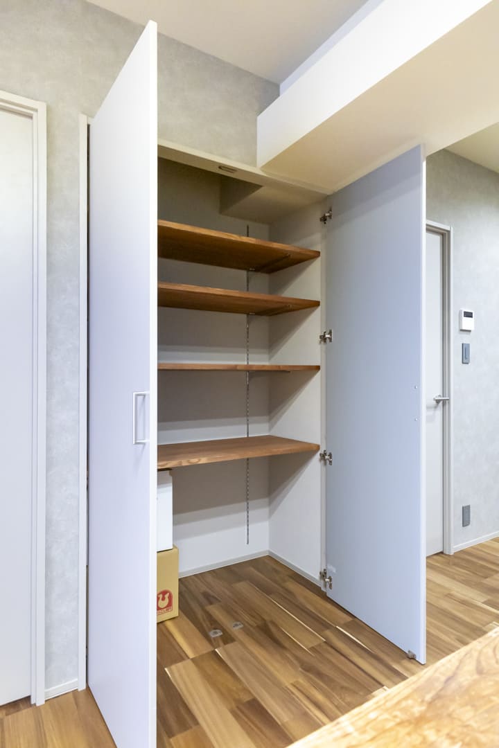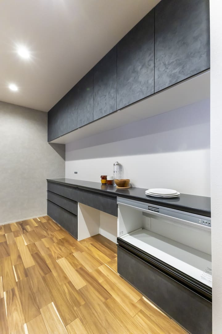 背面にはキッチンとデザインを揃えたカップボードを設置。統一感のある美しい空間を保ちながら、食料品や食器類をすっきり収納できます。蒸気排出ユニットやダストボックスを置けるスぺースも備え、日々の家事を快適にサポートします。