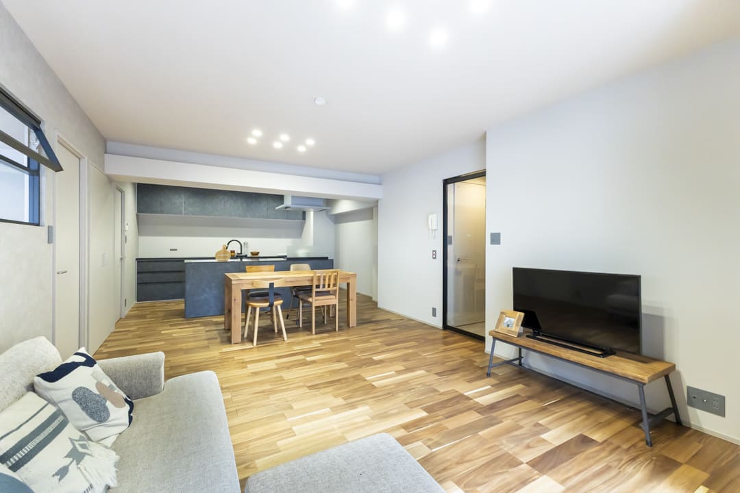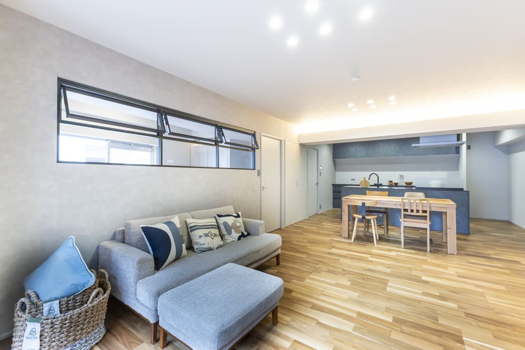 木目の美しさが際立つフローリングに、落ち着いたグレー系の壁を組み合わせた洗練された内装デザイン。間接照明がやわらかな光を添え、上質で落ち着きのある住空間を演出します。