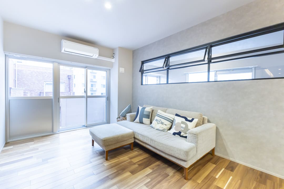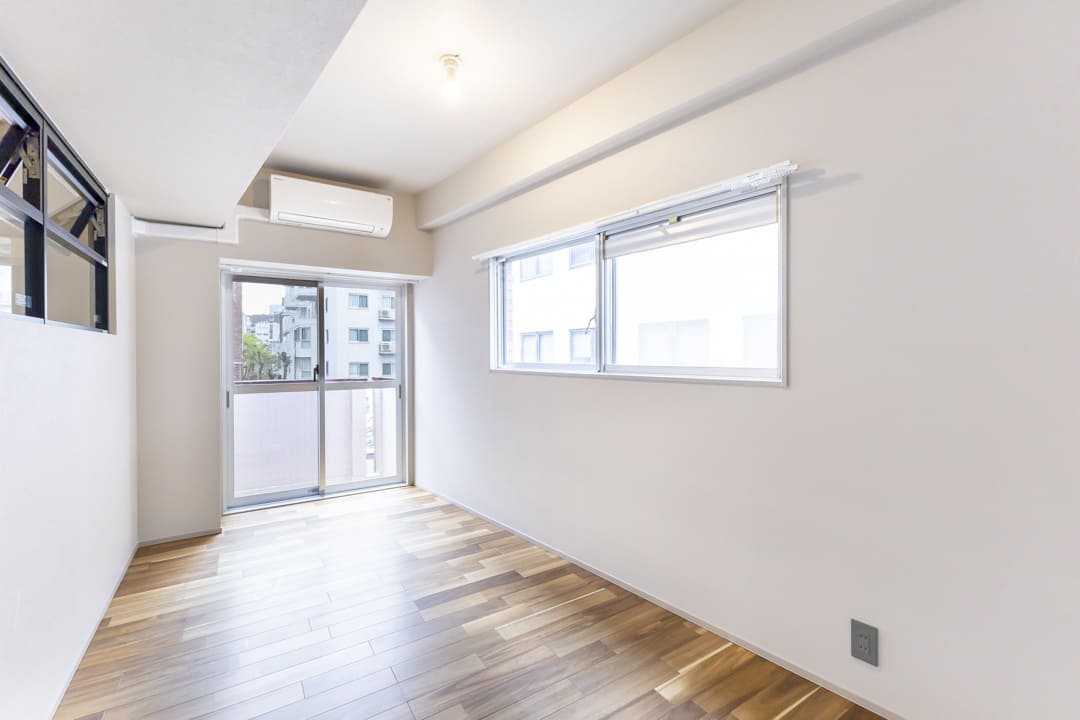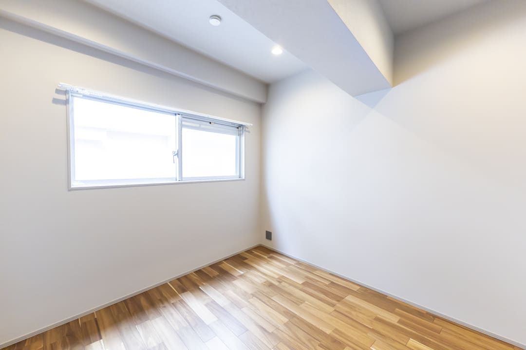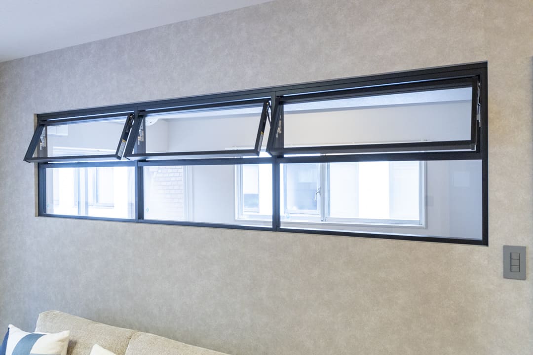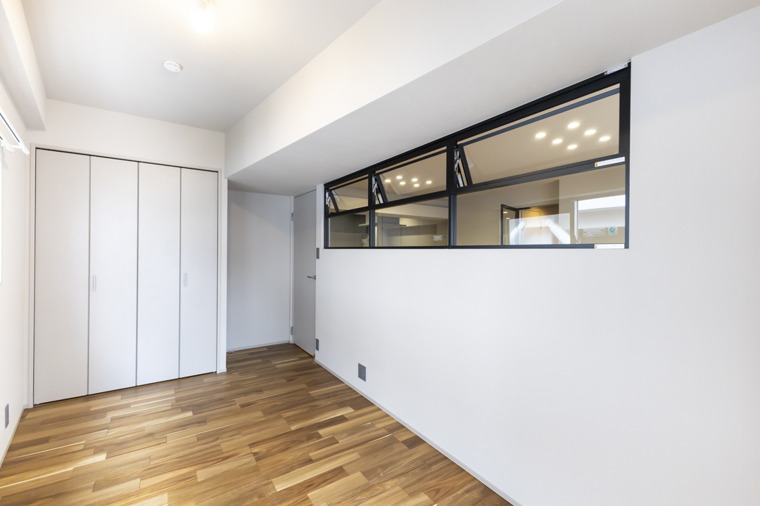 約6.0帖の洋室1。南東・南西の二面採光により、陽光と心地よい風が届きます。LDKとの間には室内窓を設け、ブラックフレームが空間のアクセントに。家族の気配を感じながら、やわらかな光を取り込めるのも嬉しいポイントです。