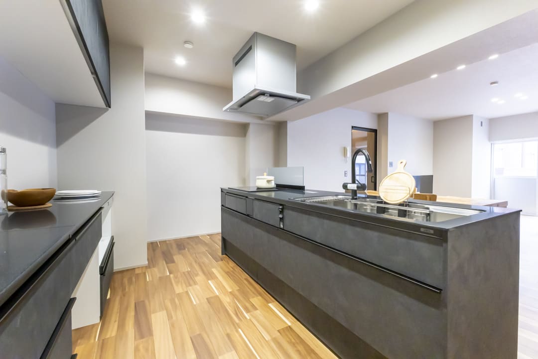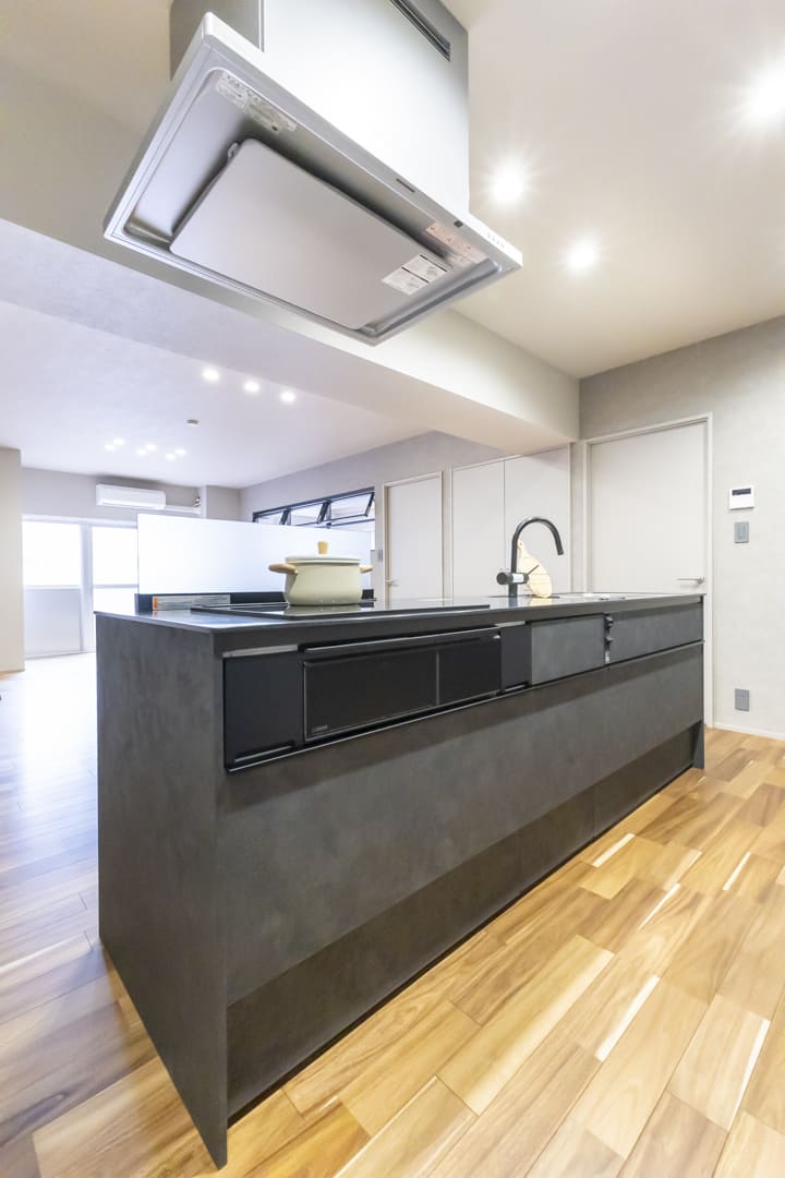 存在感のあるアイランドキッチン。左右から出入りでき、複数人でも調理や配膳がしやすい設計です。パートナーやゲストと会話を楽しみながら料理ができるのも魅力。リビングにいる人とも顔を合わせやすく、自然とコミュニケーションが生まれます。ブラック基調のデザインが美しく、空間を引き締める洗練された佇まいです。