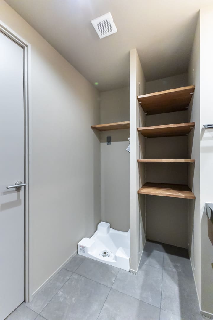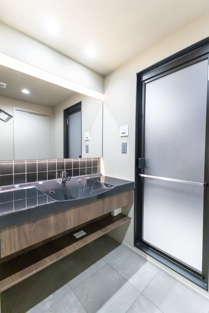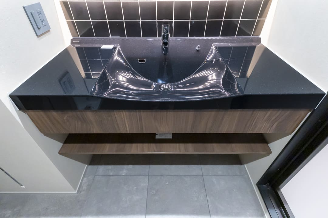ブラックのカウンターを採用した、ホテルライクな洗面化粧台。化粧品やドライヤーを置けるゆとりがあり、忙しい朝の身支度も落ち着いて行えそうです。すっきりとしたフロートタイプで、足元にはタオルなどを収納可能。洗濯機置き場の隣には可動棚も備え、使い勝手の良い空間です。