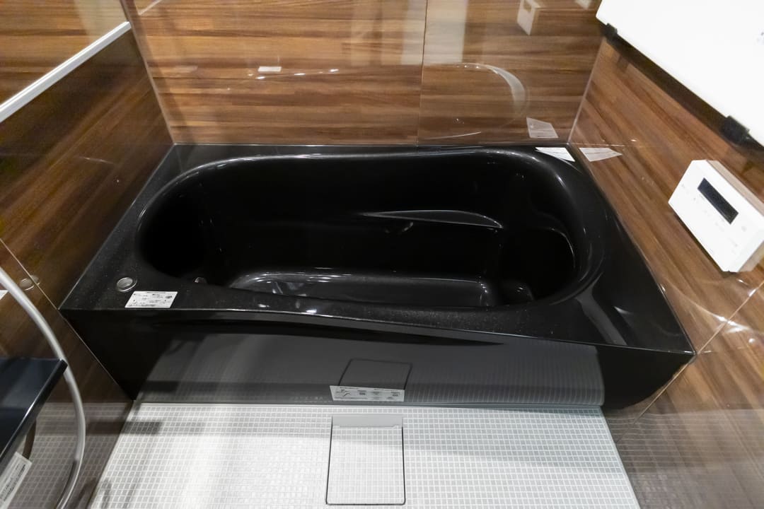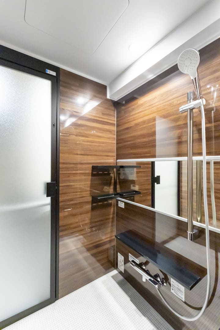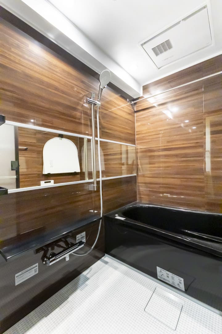 木目調の鏡面パネルとワイドミラーで高級感の漂うバスルーム。ブラックの浴槽も特徴的です。換気・暖房・乾燥・涼風機能付きで1年中快適なバスタイムに。雨天時の洗濯乾燥や湿気対策にも配慮された仕様です。追い焚き機能も備えており、家族の入浴時間がずれた際や半身浴を楽しみたい時にも便利です。