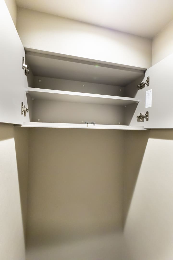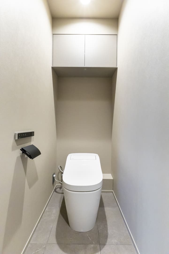 廊下に面していて独立性の高いレストルーム。Panasonic製の洗浄機能付トイレに新規交換済みです。タンクレス仕様でスタイリッシュですね。背面には吊戸棚を備え、トイレットペーパーや掃除用品をすっきり収納可能。扉付きで生活感を目隠しできるのも嬉しいポイントです。
