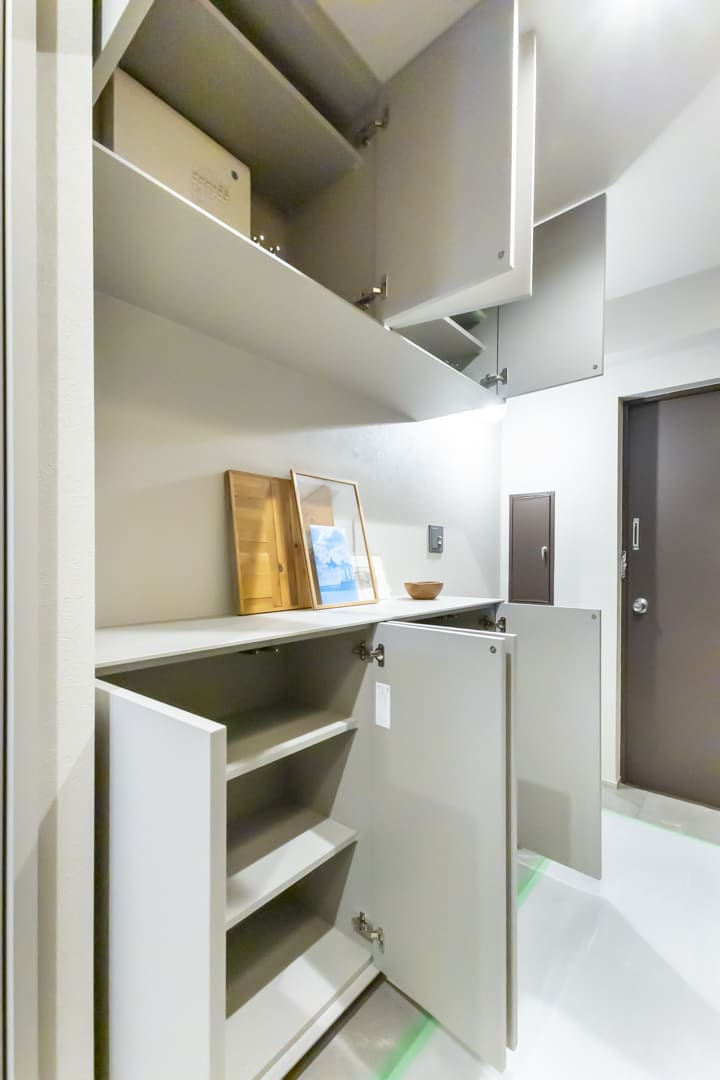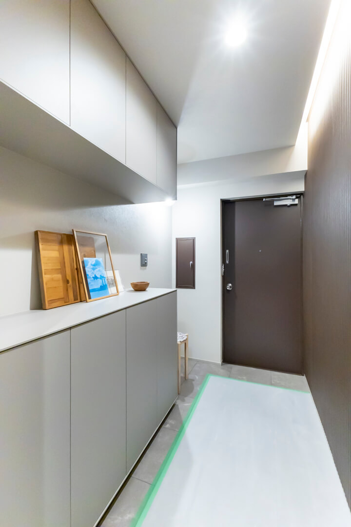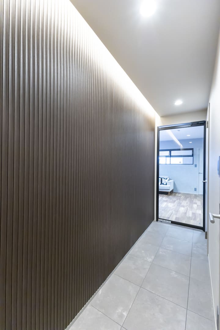 リブパネルと間接照明で上質な雰囲気が漂う玄関ホール。リビングドアから漏れる光が、その先の明るい時間を彷彿させます。シューズボックスを備え、散らかりがちな靴をすっきり収納可能。カウンターには小物やお花を飾ることができ、空間に彩りを添えることができます。