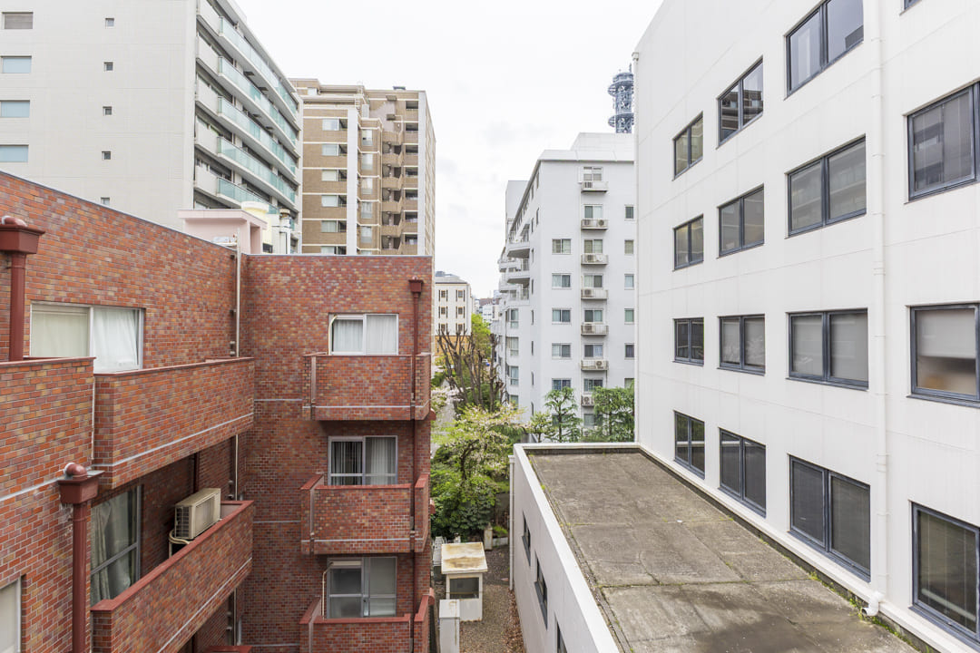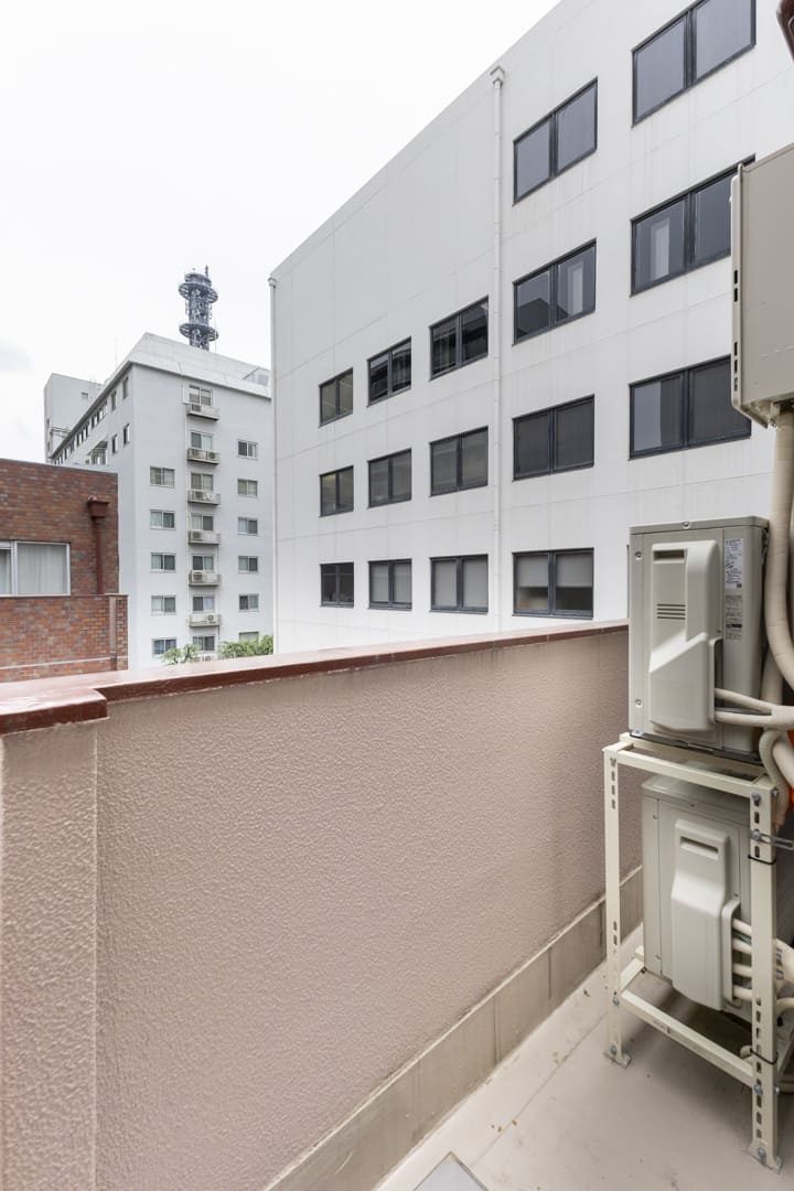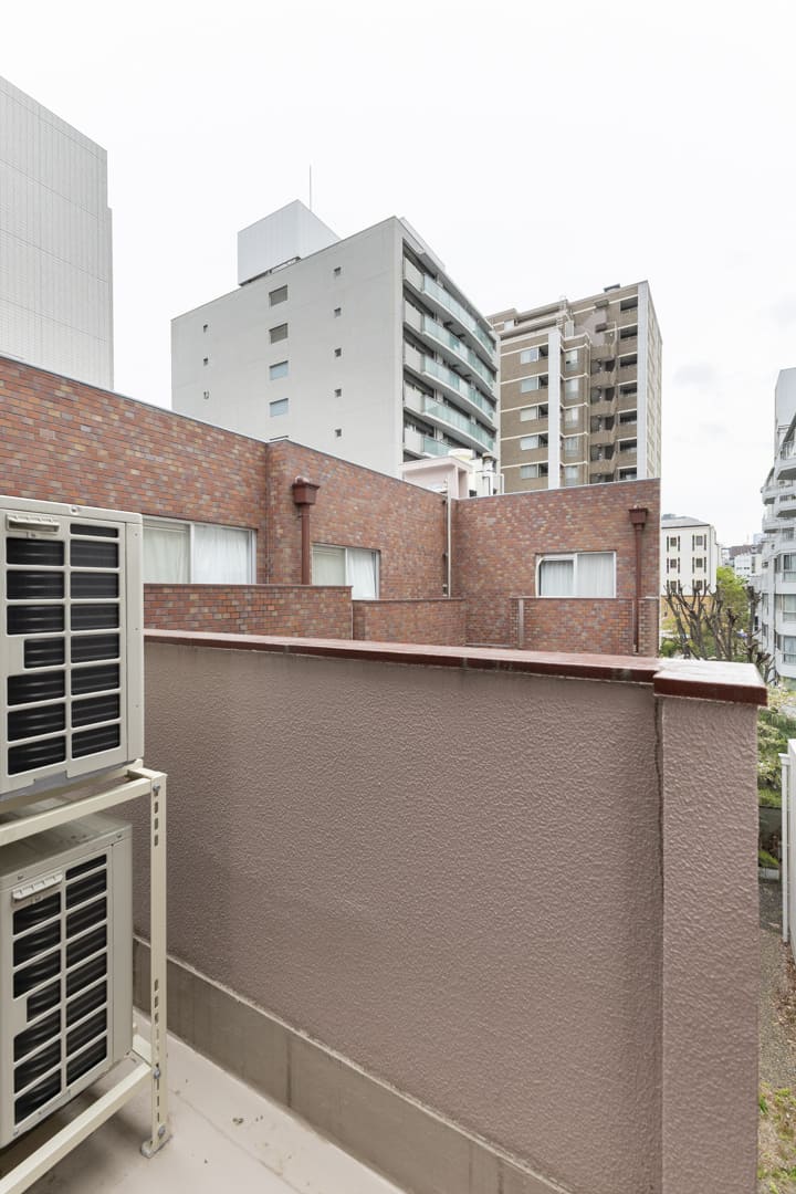 LDKと洋室1に面するバルコニー。南東向きで日当たり良好です。ややコンパクトながら、建物の合間から木々の緑を望むことができ、ささやかな潤いを感じられます。