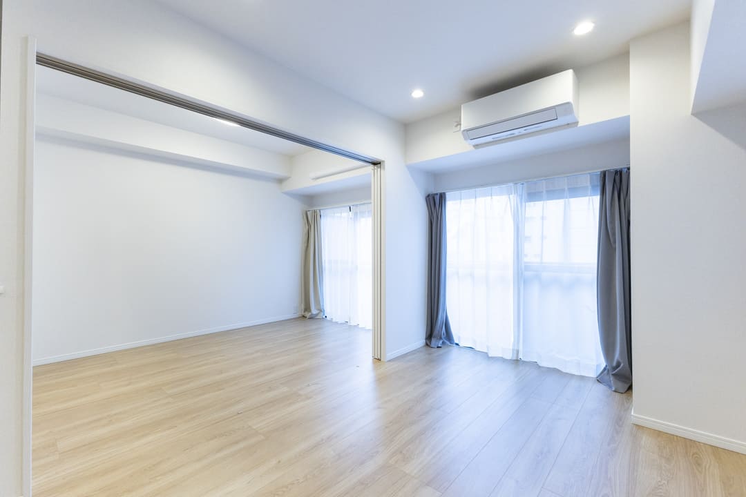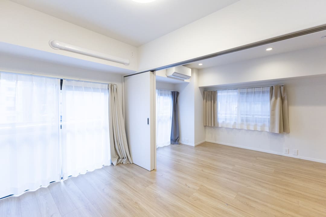 LDKに隣接する約4.6帖の寝室2。西向きバルコニーに面しており、明るい光が届きます。LDKとは引き戸で仕切られているため、ライフスタイルに合わせてフレキシブルに活用可能。扉を開ければリビングと一体となった開放的な空間に、閉めればワークスペースや書斎などのプライベートルームとしても使えます。暮らし方に寄り添いながら、さまざまなシーンで活躍してくれるお部屋です。