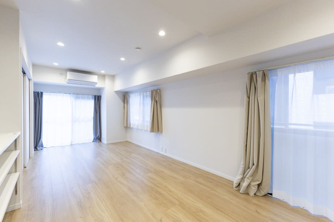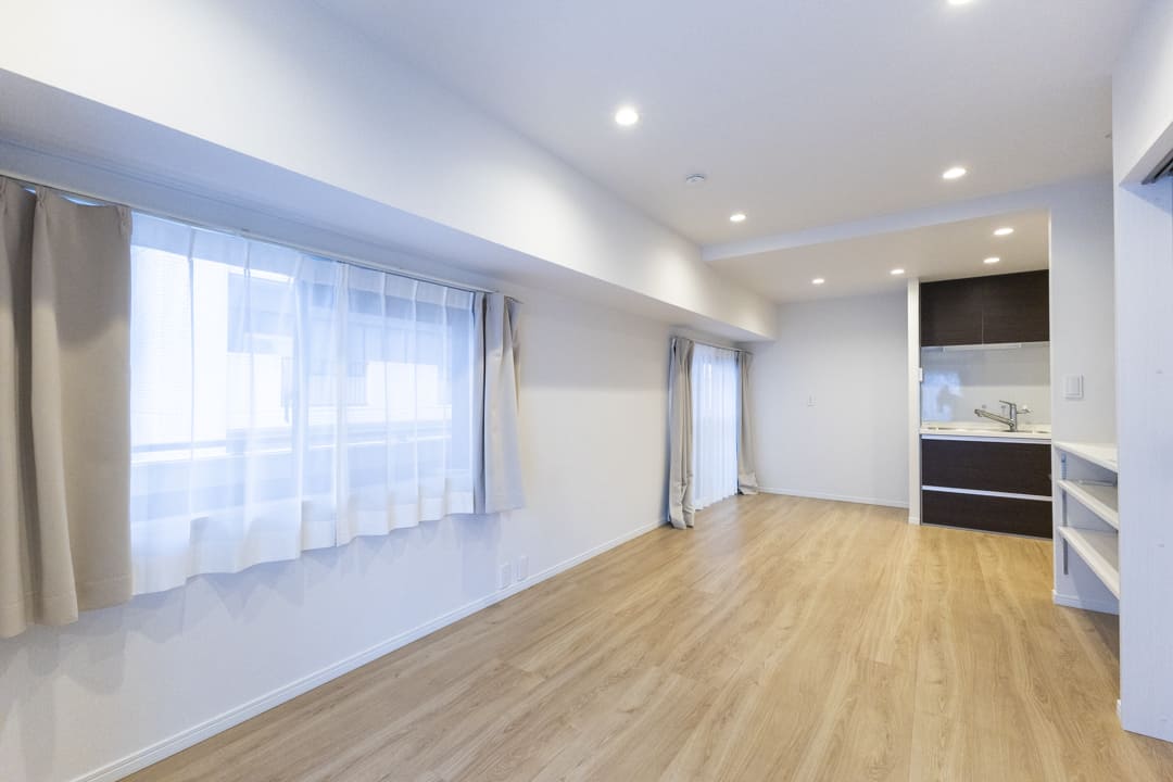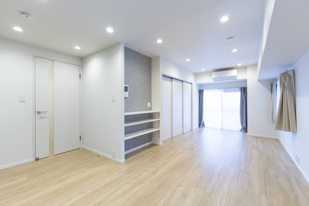 約13.9帖のLDK。北西二面採光により、心地よい自然光がたっぷり差し込みます。風通しの良さも魅力的ですね。白い壁紙に木目のフローリングを合わせた内装はインテリアを選ばず、家具選びの楽しみも広がりそう。アクセントウォールを施した飾り棚が空間のさりげないポイントとなり、シンプルな中にほどよい個性を添えています。